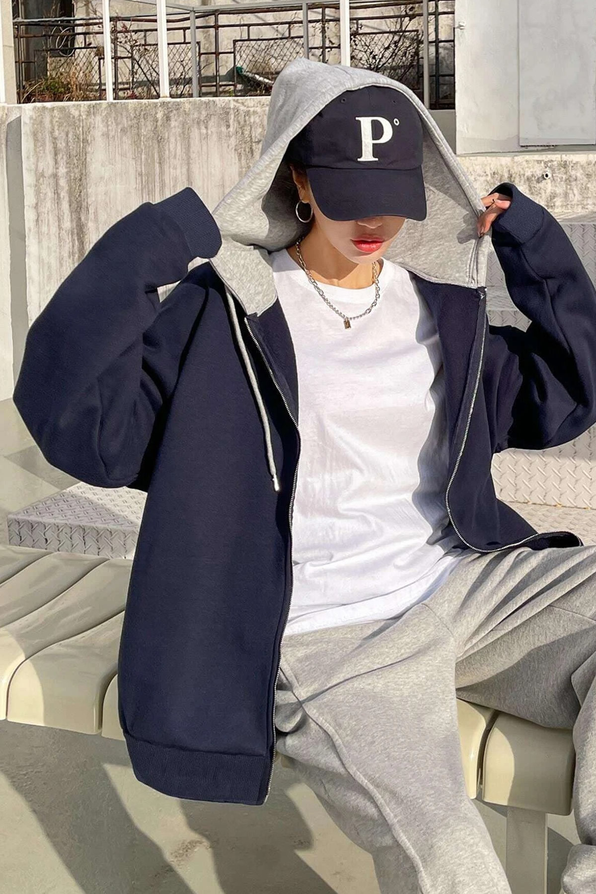 Günlük kullanıma uygun, rahat ve şık tasarımıyla dikkat çeken lacivert gri renk tonlarında unisex kapüşonlu oversize hırka.