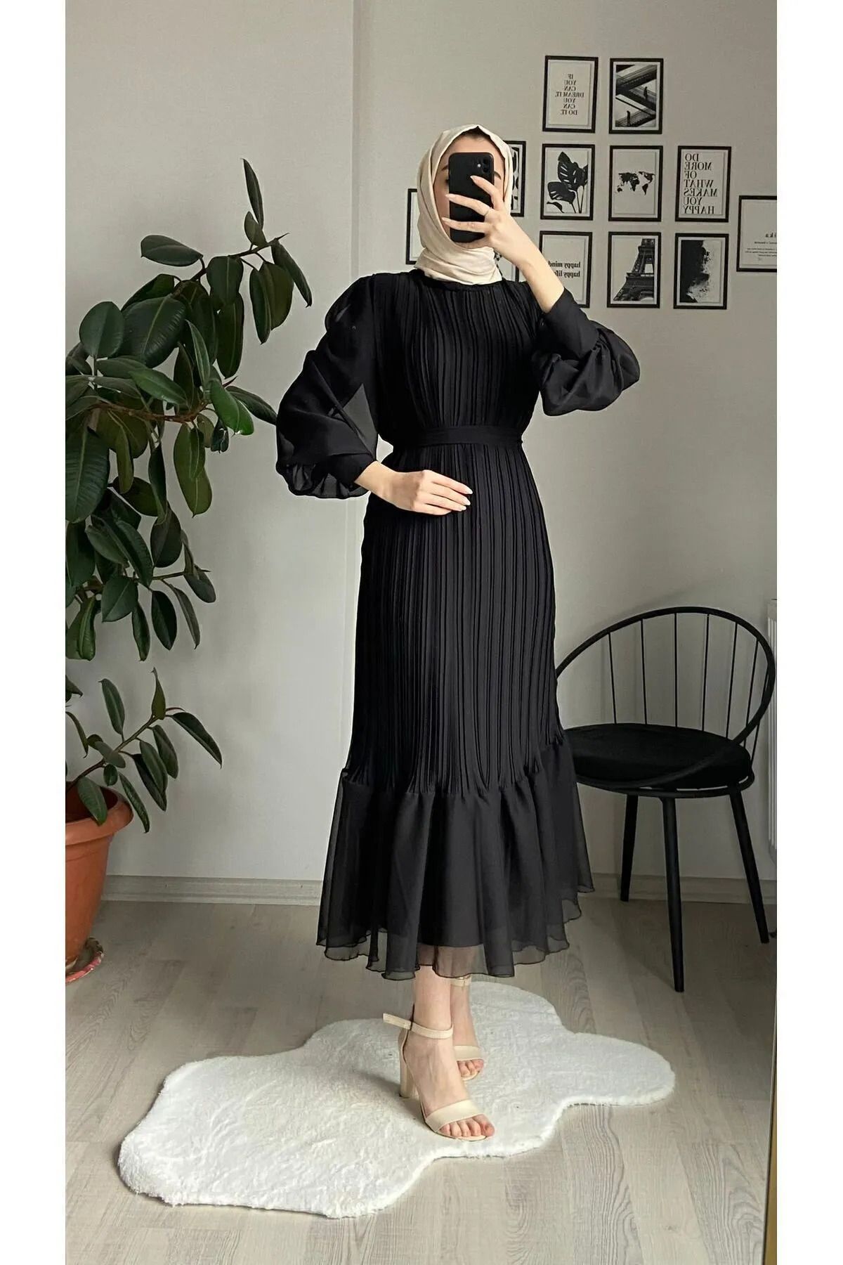 • - Rahat kesimi ile günlük kullanımda konfor sunan siyah piliseli şifon tesettür elbise, her ortamda şıklığınızı korumanızı sağlar.