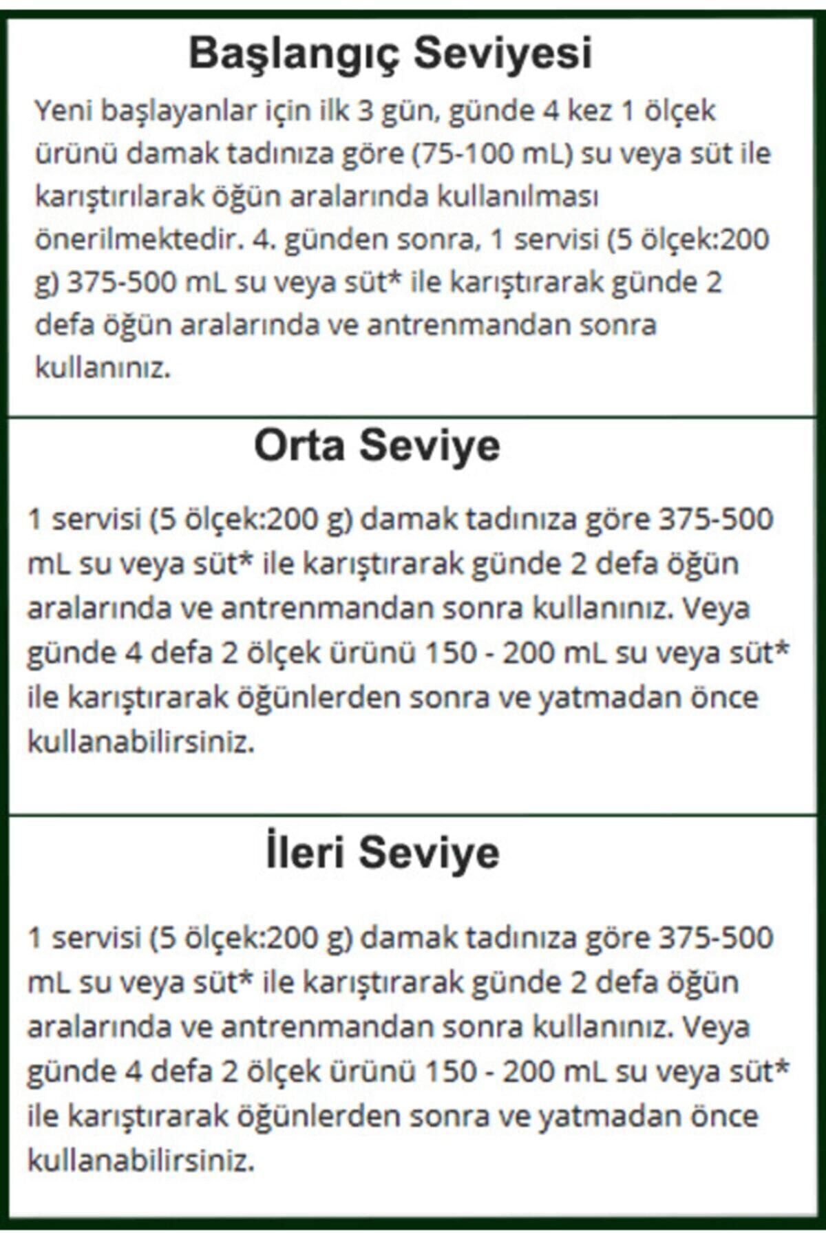 5000 Gram Servis Miktarı : 5 Ölçek (200 g) Servis Sayısı : 25 1 Servis Üründe% Günlük Değer