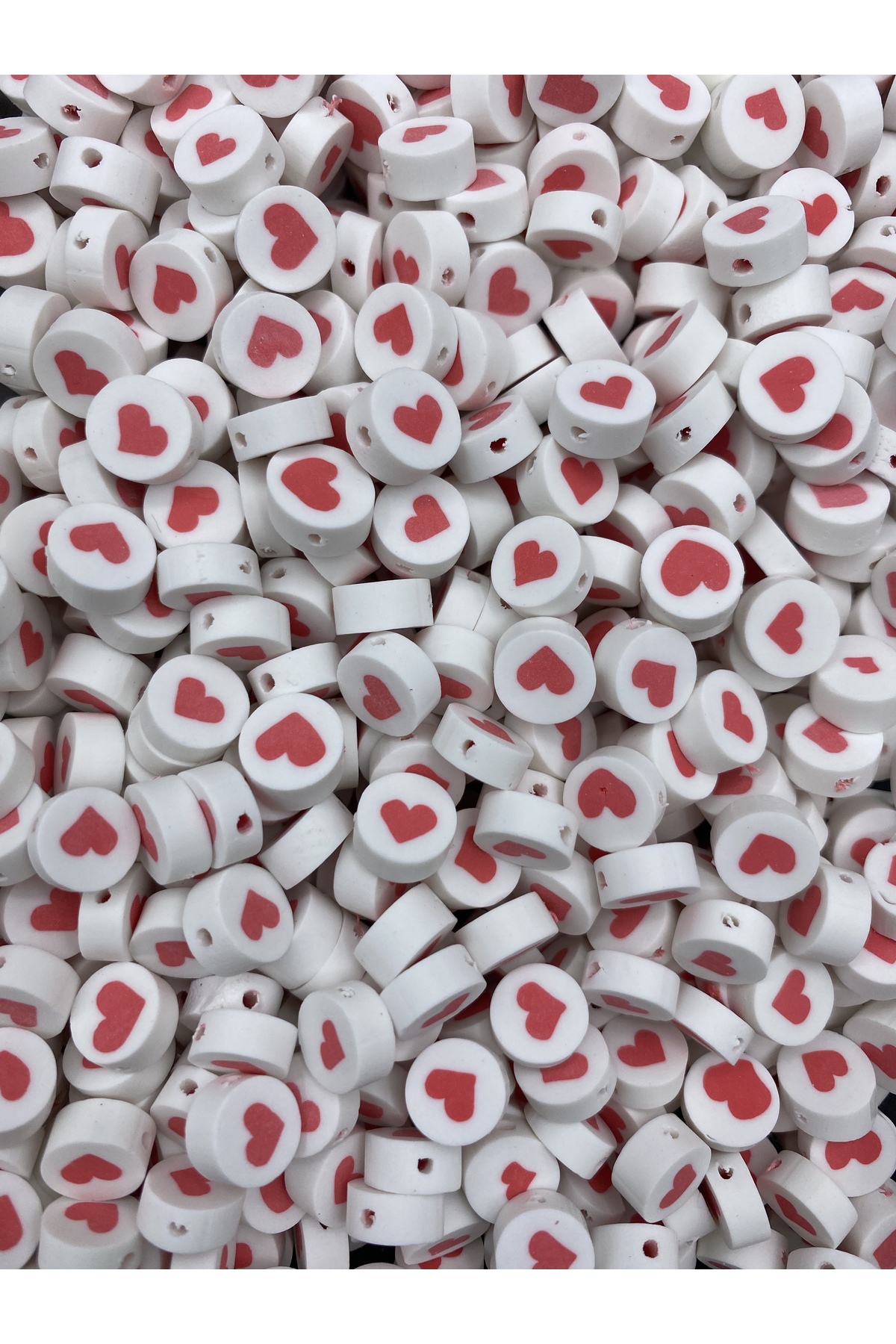 Beyaz üzeri kalp model polimer kil fimo boncuk Ürün polimer kil malzemedendir ve deliklidir.