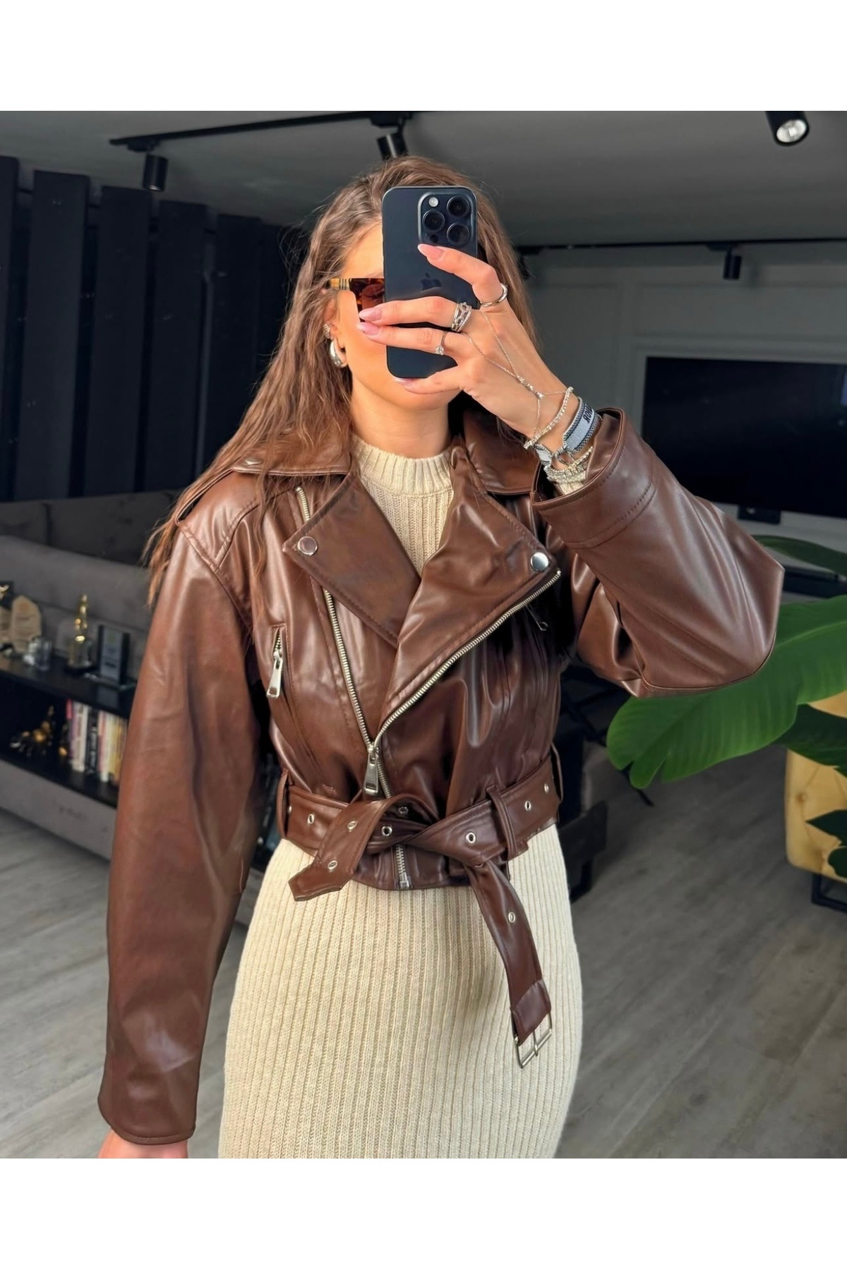 Uzun kollu, omuzları bantlı, yakalı, metal fermuarlı ön cepli kemerli, önü fermuarlı ceket.