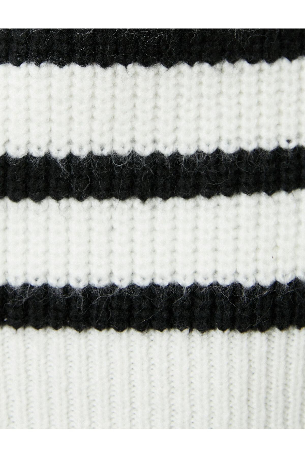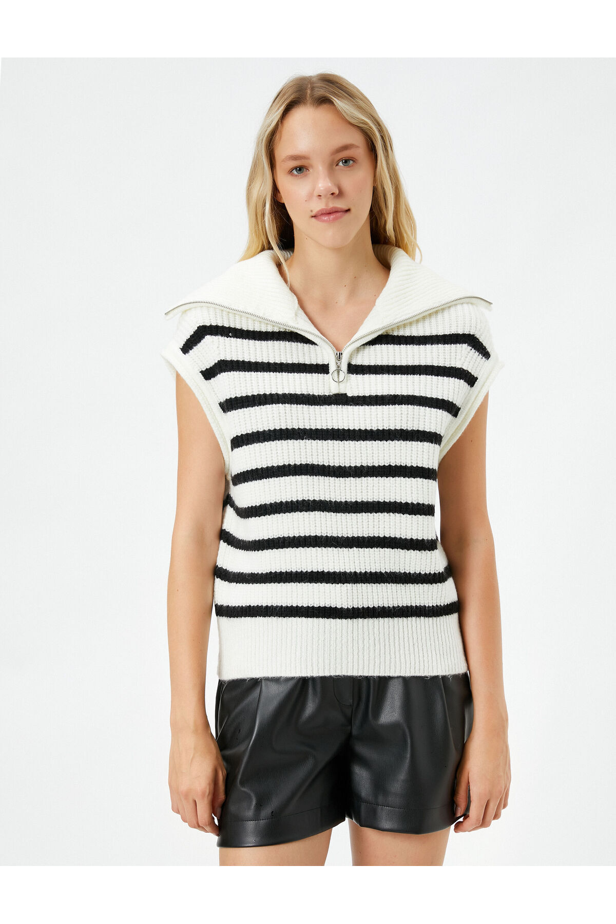 Kumaş pantolonlarla da kot pantolonla da rahatça kombinleyebileceğiniz yarım fermuar detaylı, dik yaka, kolsuz çizgili örgü süveter ile beğenileri toplayın! | Model Boy: 178 | Model Kalça: 88 | Model Üst: 60 | Model Bel: S | Model Göğüs: 84 | Model Jean: 27/32