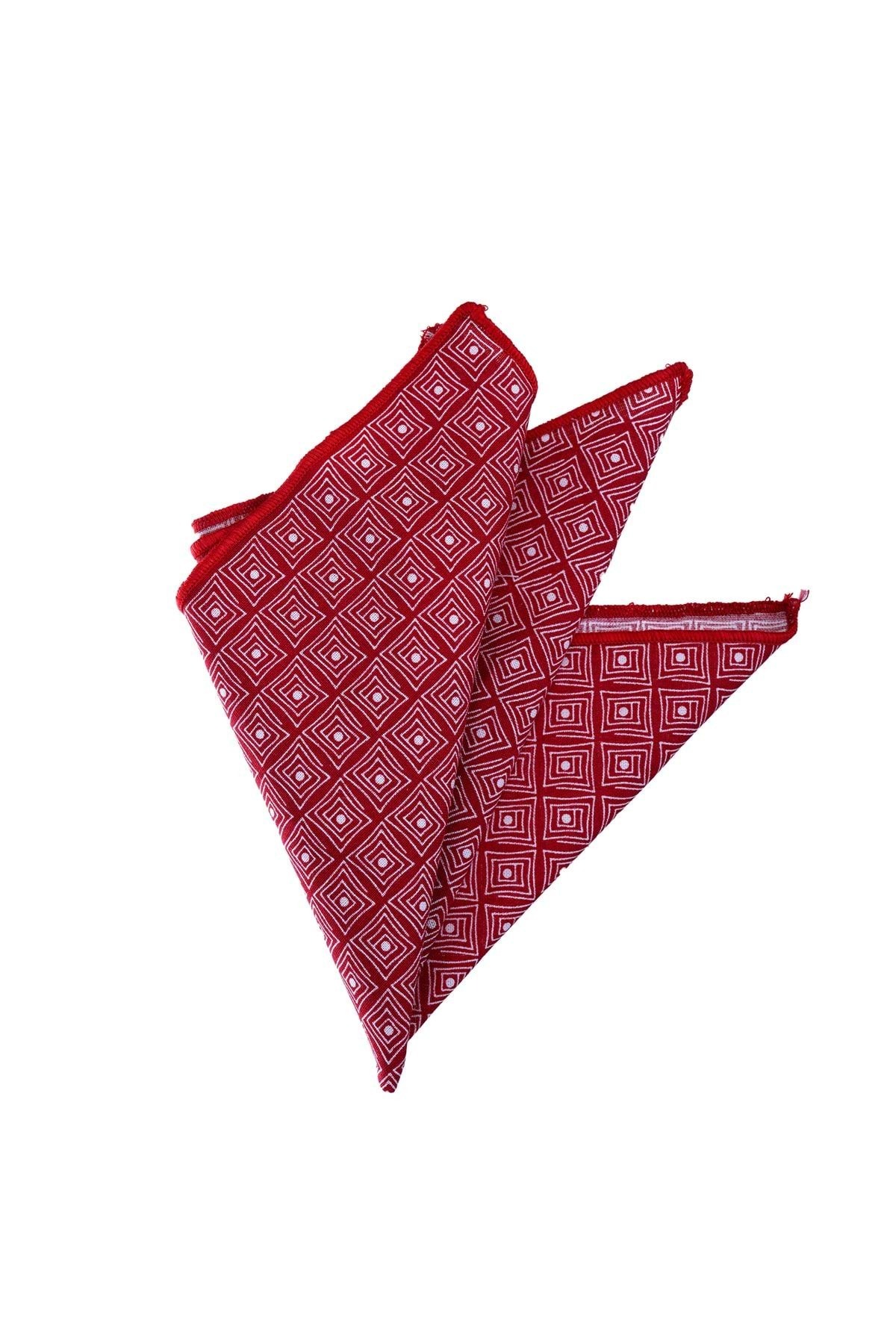 Kırmızı Beyaz Kare Geometrik Desen Dijital Baskılı Pamuk Cep Yaka Mendili