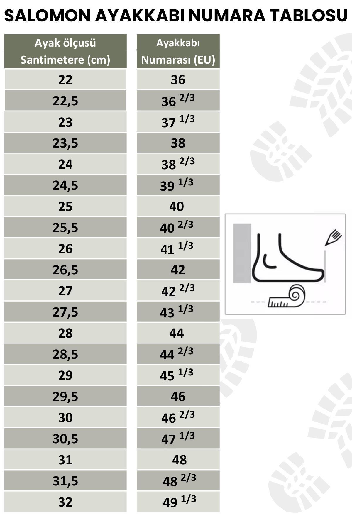 SALOMON TECHAMPHIBIAN 5 Erkek Su Ayakkabısı TECHAMPHIBIAN 5, maksimum ayak koruması için güçlendirilmiş bir burnu ve tamamen dikişli bir yapıya sahiptir. Dış taban, ıslak, kaygan yüzeylerde güvenilir tutuş için yere yapışır. Katlanmış topuklu çok yönlü, kullanımı kolay tasarım. Üst kısım çabuk kuruyan ve nefes alabilen malzemeden yapılmıştır. Salomon'un açık hava sporlarına, yeni teknolojiye ve işçiliğe olan tutkusu, zorlukların üstesinden gelmek için ilerici donanım geliştirme yeteneğimizi besliyor.Dünyanın önde gelen outdoor tasarımlarını yapan salomon dünyanın en iyi "dağ ürünlerini" sunan bir marka . Salomon SALOMON TECHAMPHIBIAN 5 Ürünün Özellikleri TECHAMPHIBIAN 5, maksimum ayak koruması için güçlendirilmiş bir burnu ve tamamen dikişli bir yapıya sahiptir. Dış taban, ıslak, kaygan yüzeylerde güvenilir tutuş için yere yapışır. Katlanmış topuklu çok yönlü, kullanımı kolay tasarım. Üst kısım çabuk kuruyan ve nefes alabilen malzemeden yapılmıştır. Islakken bile çabuk kurur Üst kısımda çabuk kuruyan ve nefes alabilen malzemeler kullanılmıştır. Kum koruma ağı çamuru ve tozu dışarıda tutar. Ayaklarını koru Güçlendirilmiş burun kısmı ve dikişli üst kısım, ayaklarınızı darbelere ve çarpmalara karşı korur. Islak yollar için kavrama Kauçuk dış tabandaki özel yiv, zemine tutunmayı artırarak hem ıslak hem de arazide mükemmel tutuş sağlar. Taban: Su Contagrip Contagrip® FD, ıslak ve düz arazide yapışma için tasarlanmış düz, dar yivli tırnaklara sahip dayanıklı bir bileşiktir. Üst Yapı: Katlanabilir Topuk Normal ayakkabı gibi giyilebilen ve katlandığında sandalet gibi rahatlıkla giyilip çıkarılabilen bir yapı. Bağcık Sistemi: Hızlı Bağcık İnce ve güçlü bir ip tek seferde gerilebilir. Tasarımın takılması ve çıkarılması kolaydır. Orta taban: EnergyCell Yüksek performanslı EVA köpük yastıklar darbe etkisi. Üst Malzeme: Kum Filesi Sıkı ağ, ayağın ve tabanlığın arasındaki kiri ve kumu dışarıda tutar. Astar malzemesi: Sentetik astar Dayanıklı ve koruyucu astar. Üst Yapı: Ayarlanabilir topuk kayışı Güvenli topuk tutuşu için ayarlanabilir topuk kayışı. Üst Yapı: Dantel Cep Quicklace bağcık sisteminin kolayca saklanması için cep. üst malzeme çabuk kuruyan tekstil Sockliner: Geri dönüştürülmüş malzemelerden yapılmış S.CafeR iç taban kılıfı Çığır açan S.Cafe® teknolojisine dayanan bu çorap astarı, üstün nem kontrolü ve koku kontrolü için kahve telvesinden yapılmıştır. üst yapı koruyucu burun Sürdürülebilirlik PFC-ec içermez Salomon Erkek Ayakkabı Beden Tablosu