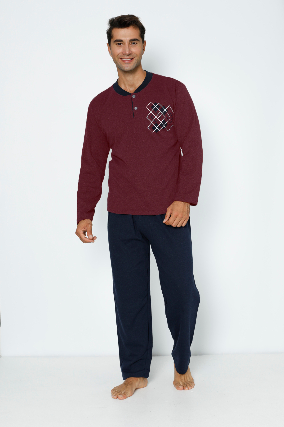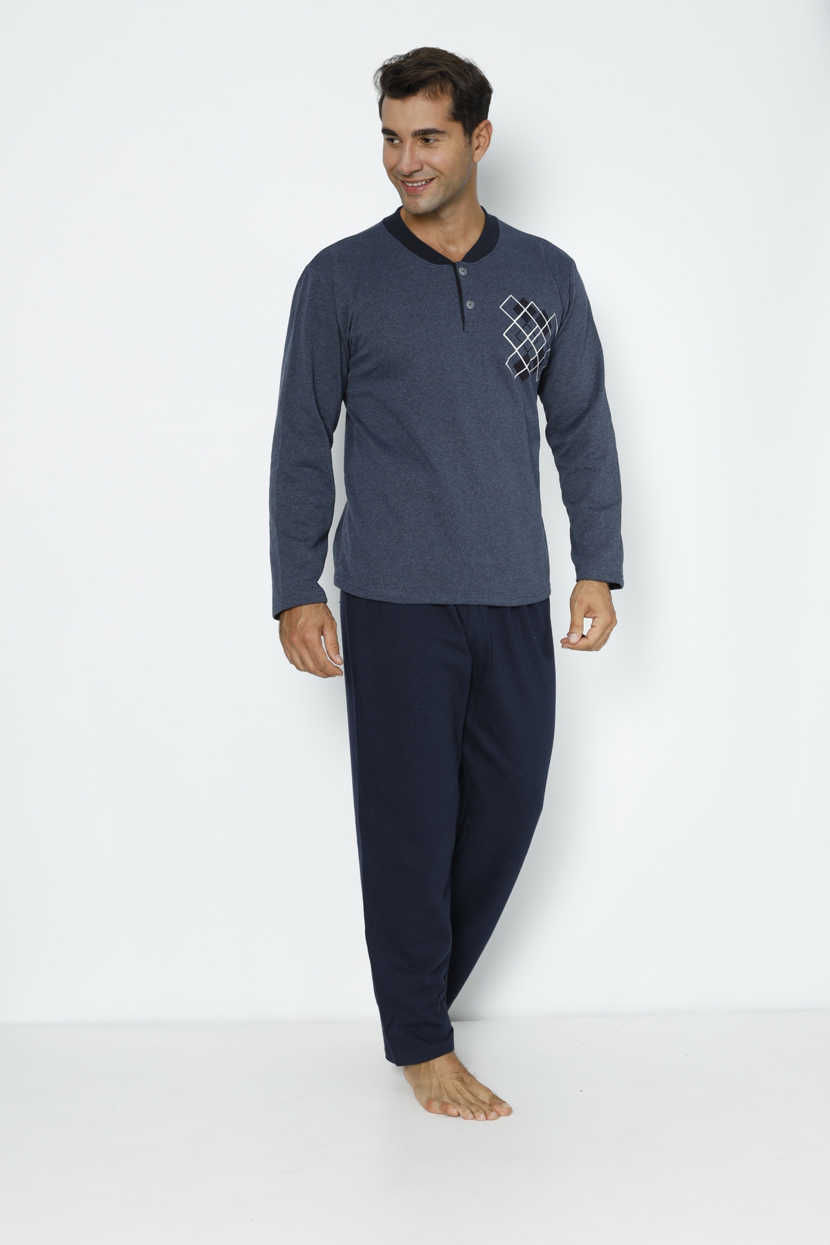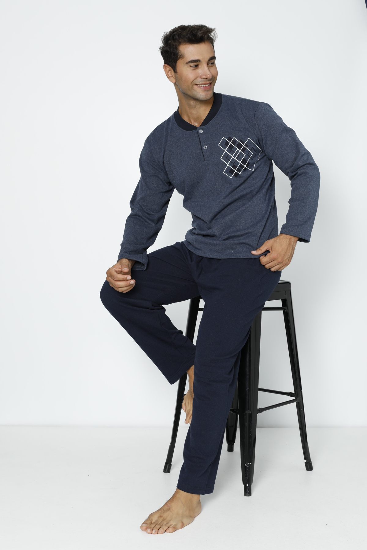 Lacivert rengiyle zamansız bir tarz sunan geometrik desenler, pijama takımınıza modern bir dokunuş katarken kolayca kombinlenebilir.