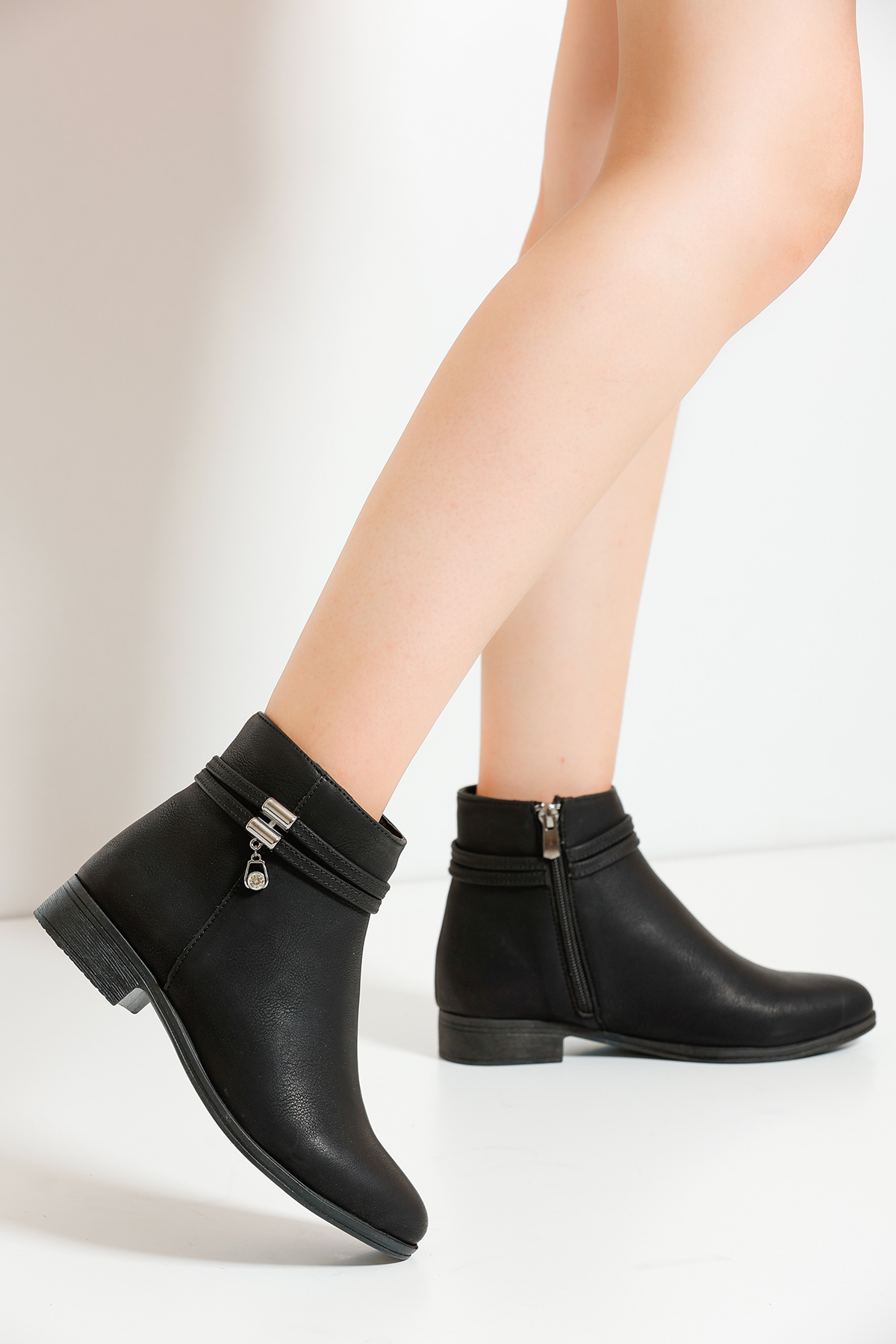 - Rahatlık ve şıklığı bir arada sunan siyah cilt kadın bot, günlük kullanım için idealdir.