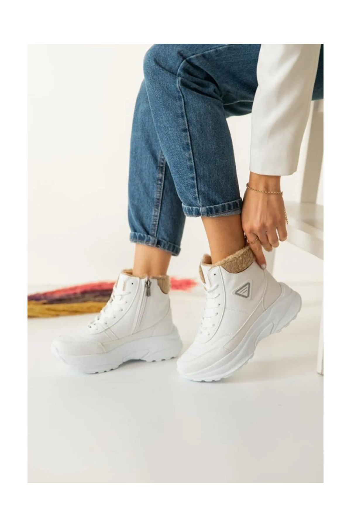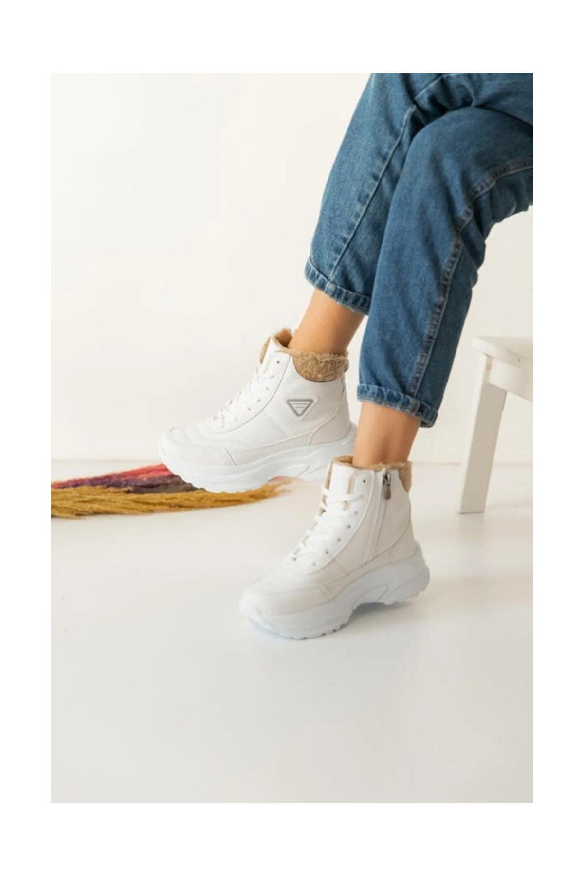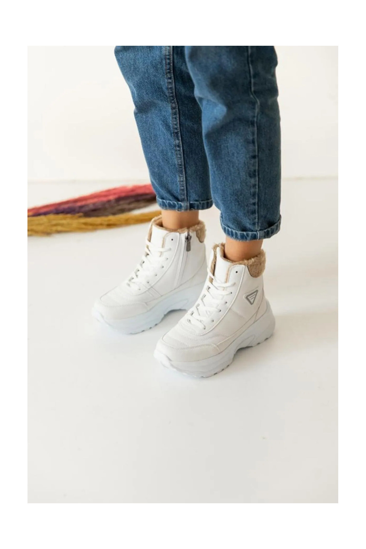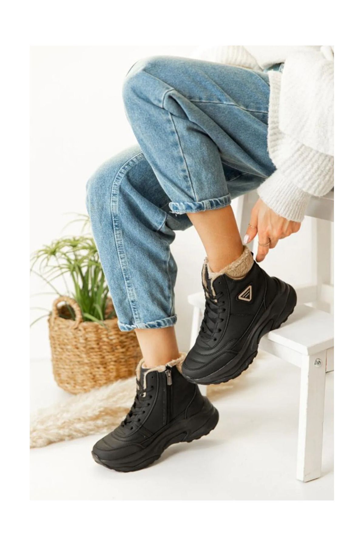 Acropol İçi Yünlü Siyah Kürklü Kışlık Kadın Bot - Beyaz