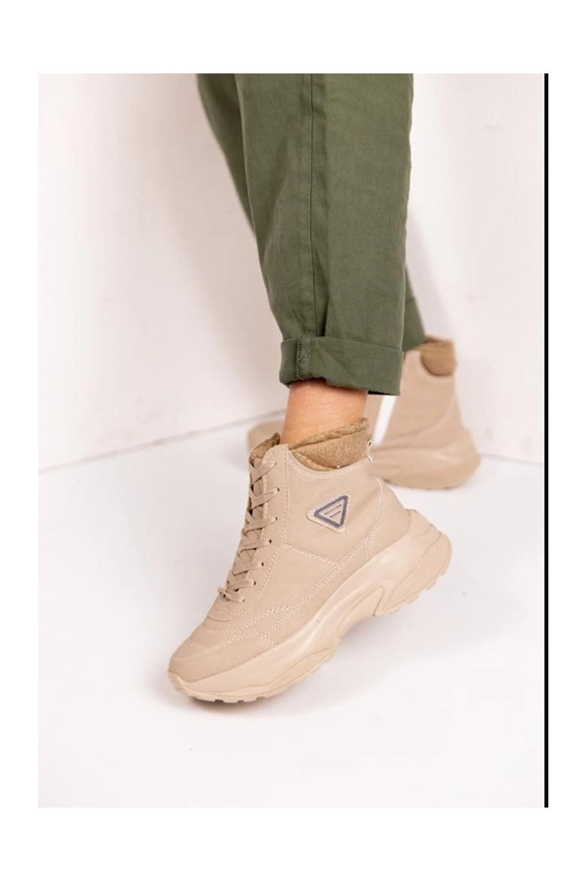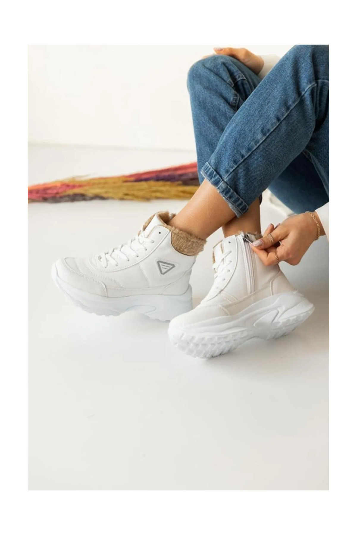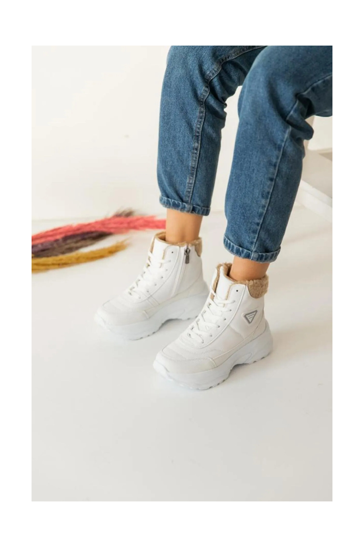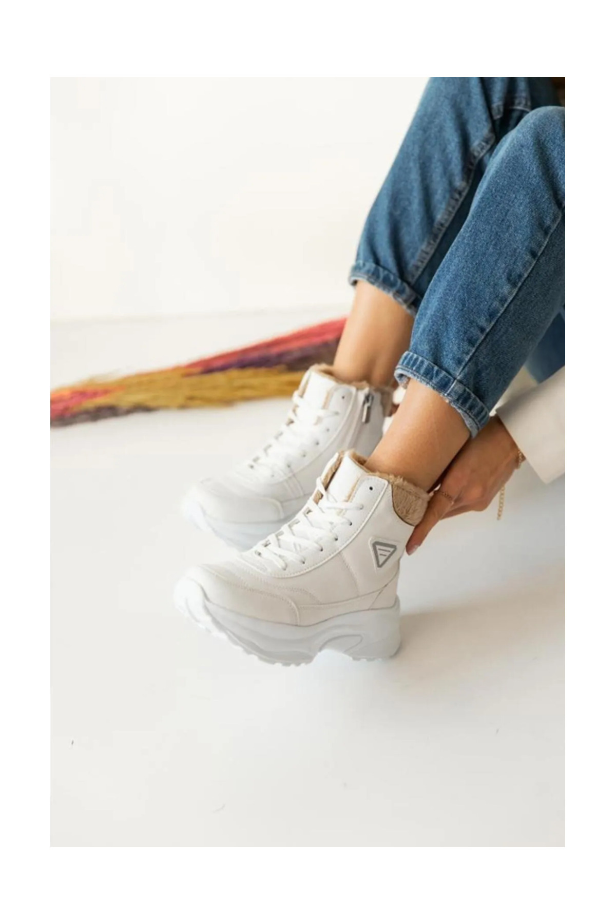 Acropol İçi Yünlü Siyah Kürklü Kışlık Kadın Bot - Beyaz