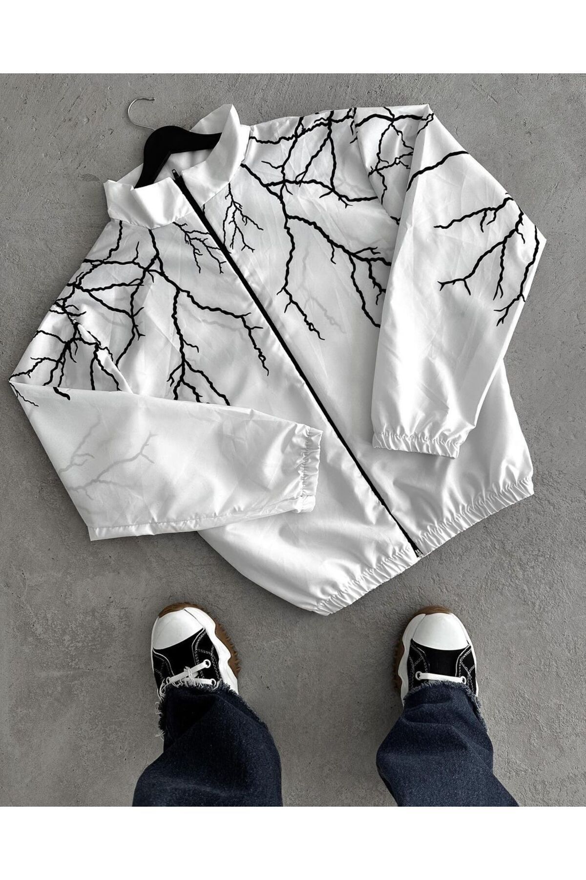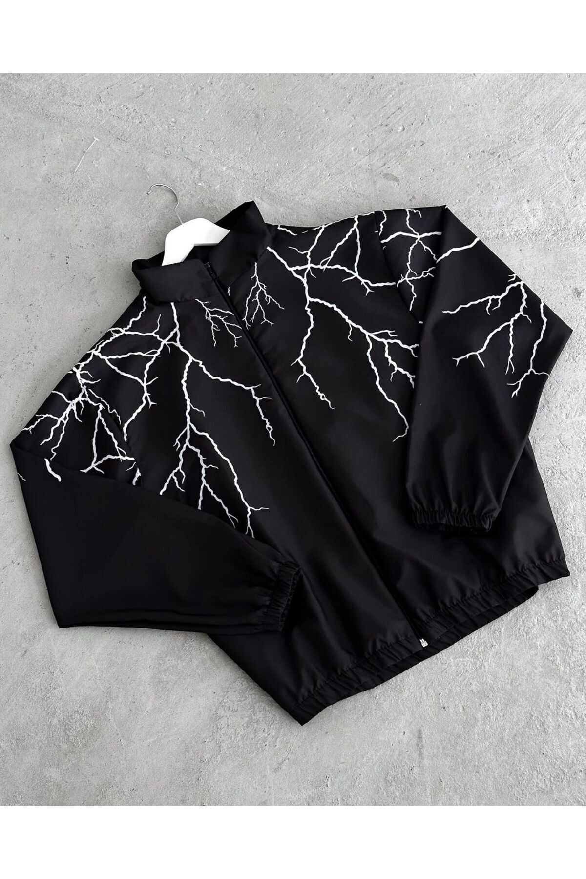 Yıldırım baskısıyla dikkat çeken bu yağmurluk, spor ve casual tarza modern bir dokunuş katıyor.