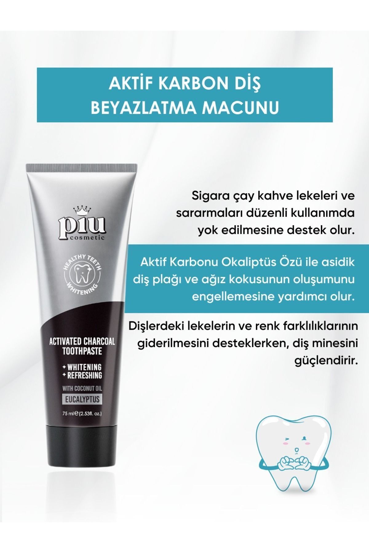 Piu Cosmetic Aktif Karbon Diş Beyazlatma Macunu 75 ml Piu Cosmetic Aktif Karbon Diş Macunu daha beyazdişlere ve ferah bir nefese kavuşmak isteyenler için tasarlanmıştır. Düzenlikullanıma beyaz dişlere ve ferahlık hissine kavuşmanızı sağlar. Özellikle yemek ve kahveden sigaradan kaynaklananlekeleri gidermeye yardımcıdır Aktif Karbon Diş Beyazlatıcı Macun, okaliptüs vehindistan cevizi yağı sayesinde
