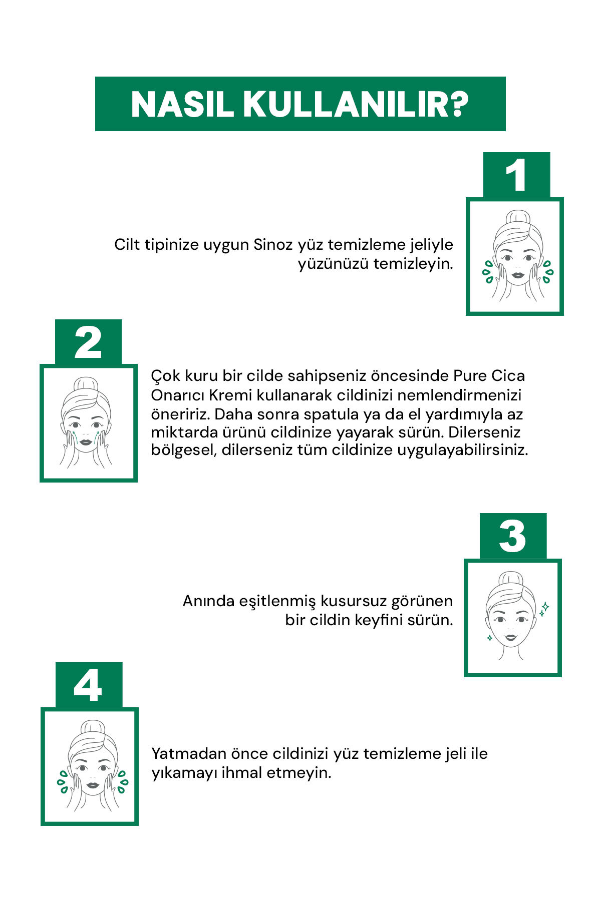 Kullanım: Günlük kullanım için uygundur. Temizlemiş olduğunuz yüzünüze yeterli miktarda Sinoz Pure Cica Tiger Grass Ton Eşitleyici Kızarıklık Karşıtı Onarıcı Bakım Kremini sünger veya el yardımıyla sürerek yedirin. Tüm cilt tiplerine uygundur.