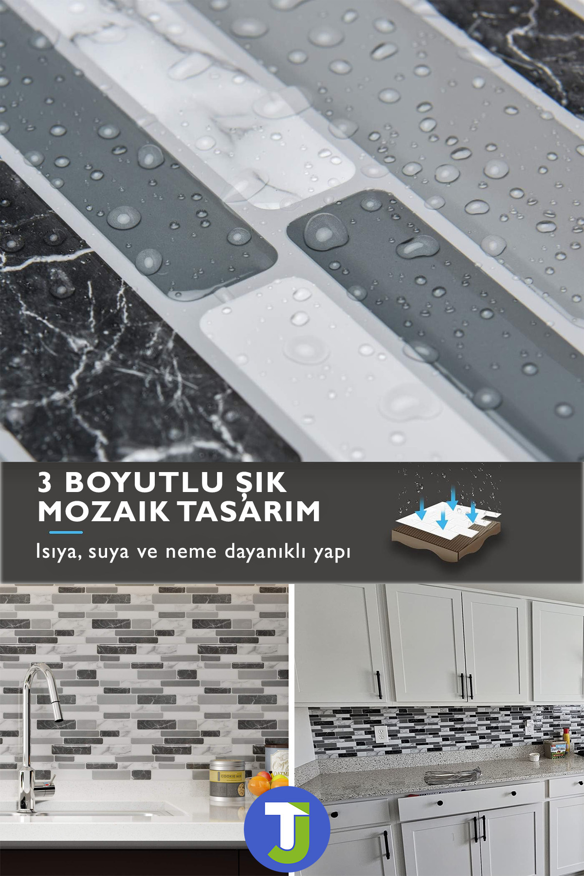 3D Mozaik Görünümlü PVC Mutfak Tezgah Arası Kendinden Yapışkanlı Kaplama Bu özel PVC kaplama, mutfak tezgahı arasında kullanım için tasarlanmıştır.