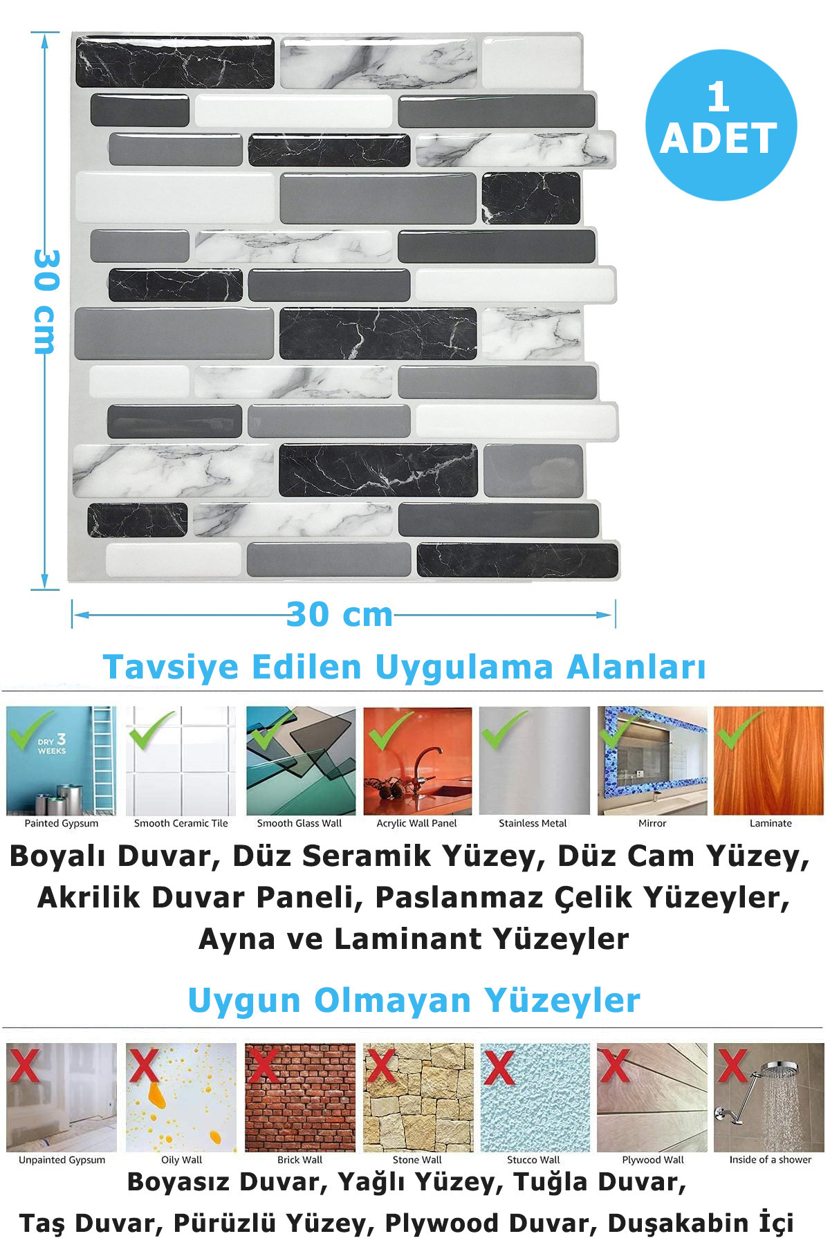 Özellikler: • Boyut: 30cm x 30cm• Kalınlık: 0,1 mm • Malzeme: PVC • Efekt: 3D • Uygulama: Kendinden yapışkanlı • Uygulama Yüzeyi: Temiz, kuru, düz ve pürüzsüz yüzeyler Öne Çıkan Özellikler: • Kolay Uygulama: Kendinden yapışkanlı tasarımı sayesinde uygulama oldukça basittir.