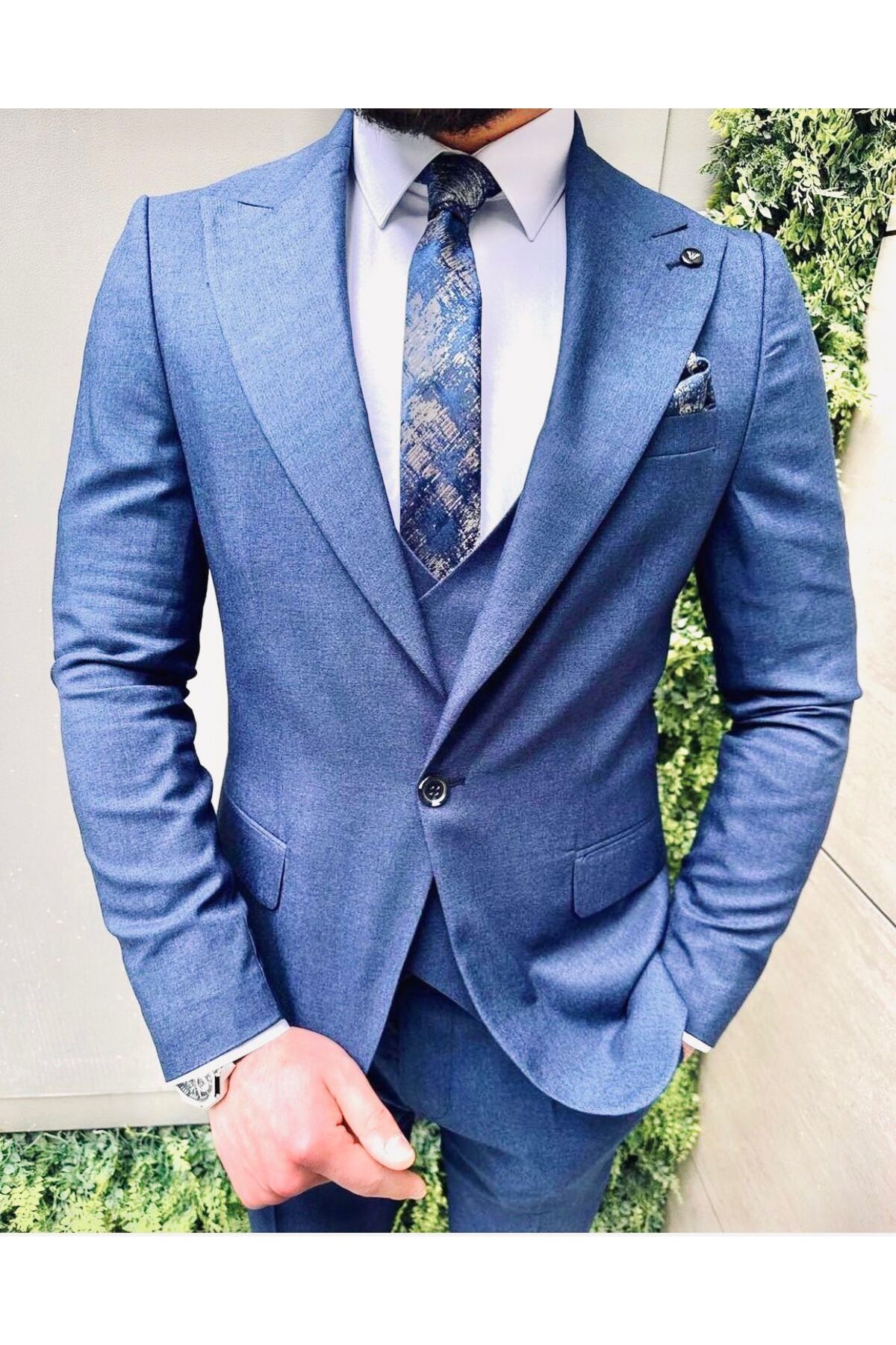 - Sivri yaka detayı ile resmiyeti ön plana çıkaran bu takım elbise, sofistike bir hava katmaktadır