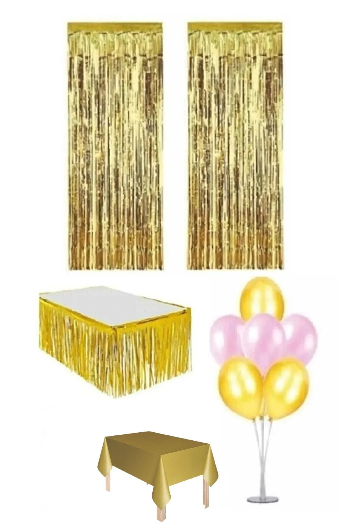 Paket içerisinde :Gold renk metalize perde 1 paket 90x200, 1 adet Gold renk metalize masa eteği 90x350 ,1 adet plastik masa örtüsü Gold renk 120x180, 7'li balon standı +7 adet metalik balon(4 adet gold, 3 adet pembe,)