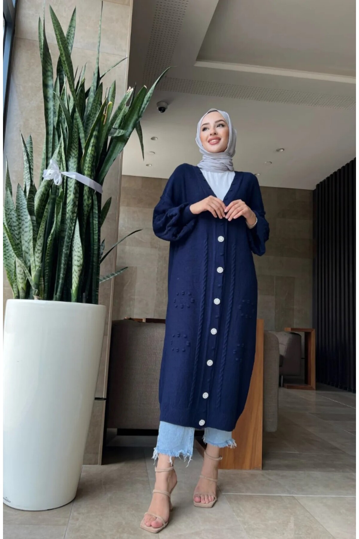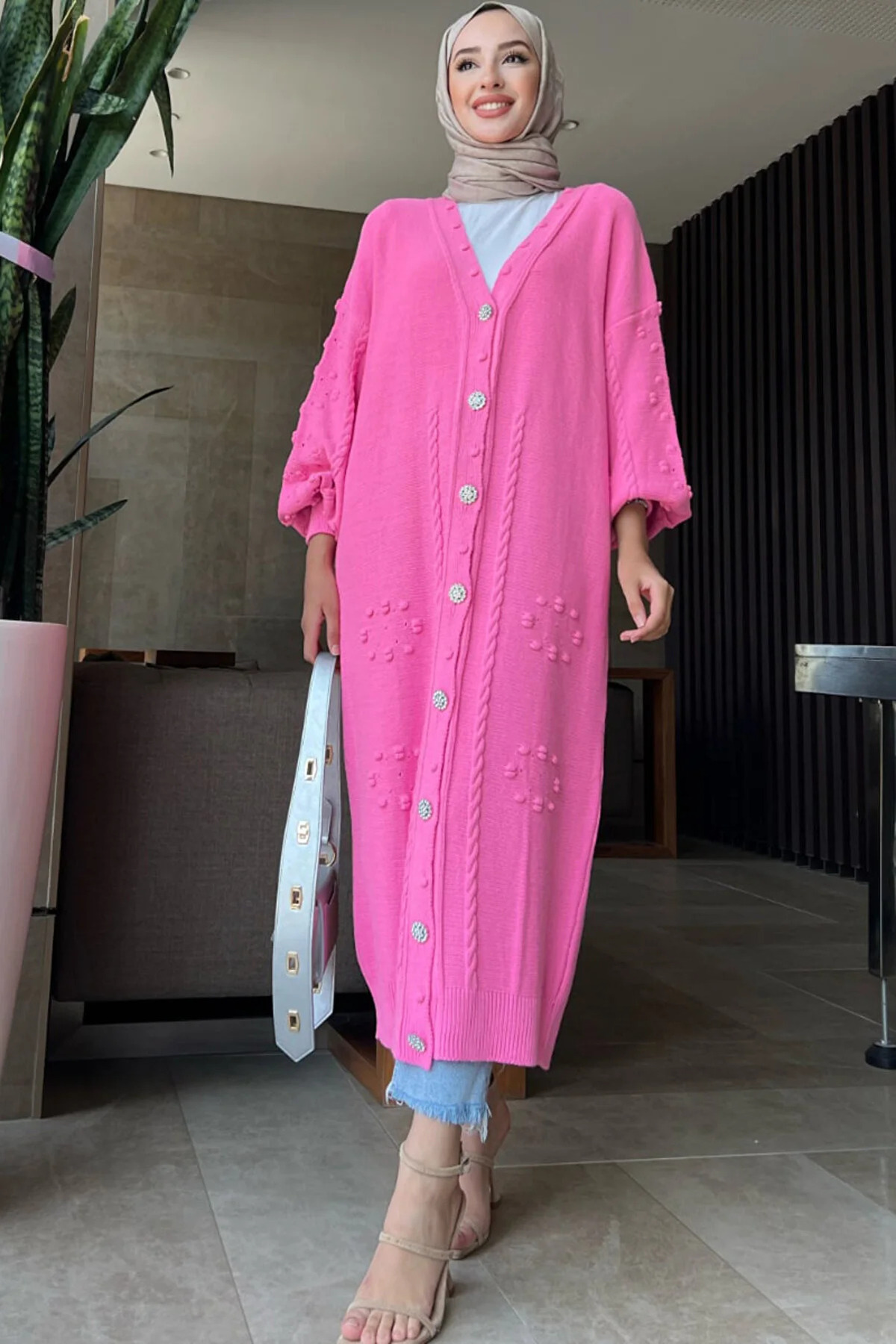V yaka tasarımı ile zarif bir görünüm sağlarken, inci düğmelerle detaylandırılan hırka sofistike bir dokunuş katmaktadır.