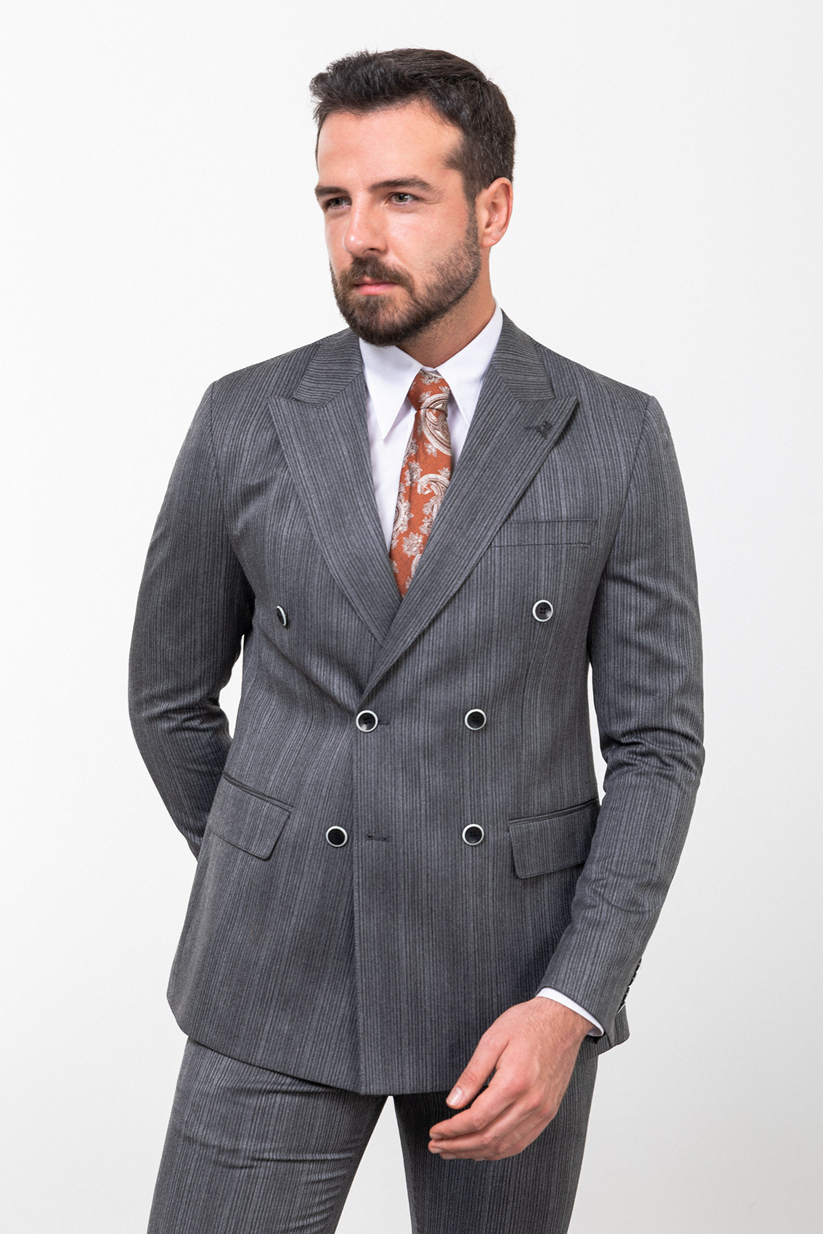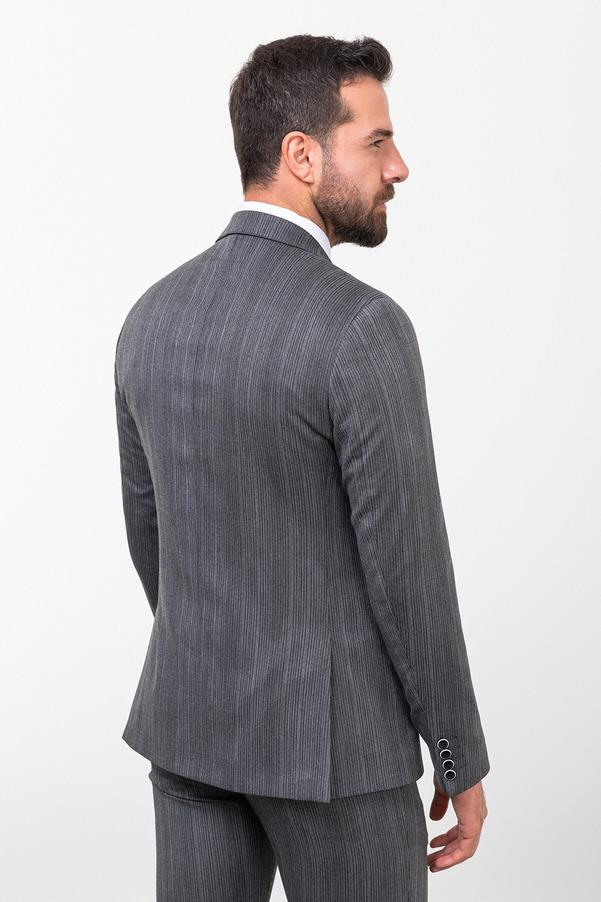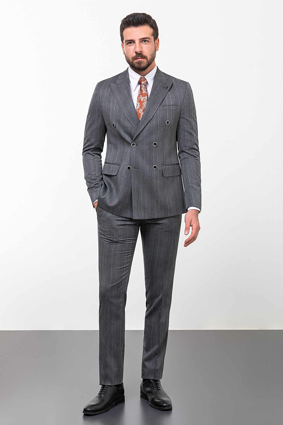 Çizgili deseniyle dikkat çeken bu takım elbise, sofistike bir stil ifade ederken slim fit kalıbı sayesinde modern bir siluet çizer