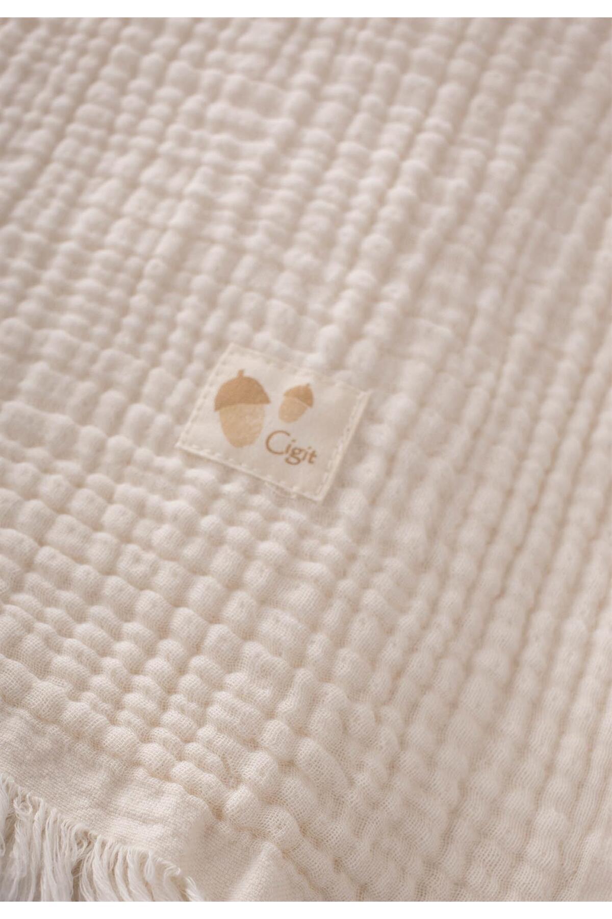 Dört Kat Püsküllü Müslin Battaniye 80x120 Cm Naturel