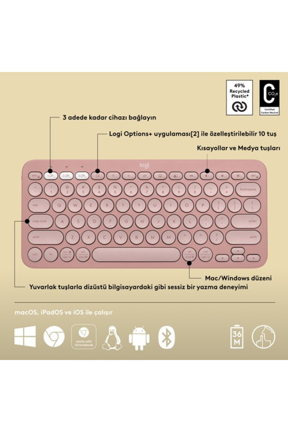 Logi Options+ uygulaması ile 10 Fn tuşunu kişiselleştirin ve tüm işlemleri dilediğiniz şekilde yapın. İyi Hissettiren Yazma Deneyimi Parmaklarınızın Ucunda: Pebble Keys 2 K380s Sessiz Klavye, zahmetsiz ve rahat yazabilmeniz için çukurlu yuvarlak tuşlardan oluşur ve tanıdık, dizüstü bilgisayar benzeri bir yazma deneyimi sunar. Daha Uzun Süre Kullanın: Bu kablosuz klavye, 3 yıllık pil, otomatik uyku güç tasarrufu modu ve sorunsuz bir kullanım deneyimini amaçlayan %50 daha fazla pil ömrü ile size saatlerce kullanım imkanı sağlar