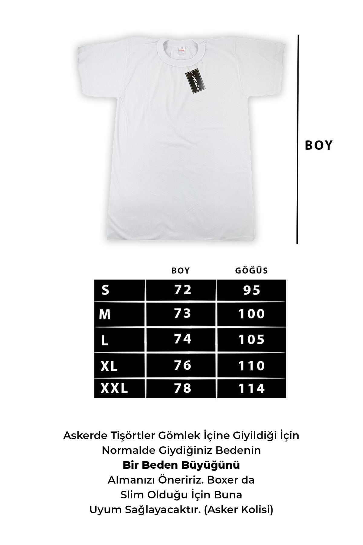 12'li Denizci Temel Bedelli Askerlik Seti - Hatay İskenderun Denizci Asker İç Çamaşır Denizci asker tişörtü (fanila) bedeni: Normal (regular) bedendir Boxer: Slim (Yapışan) model Tişörtü gömlek içerisine giyeceğiniz ve bedenlerimiz yarım beden dar olduğu için bir beden büyük tercih etmenizi öneririz. Boxer da slim boxer olacağı için tam olacaktır. Set içeriği: 12 adet beyaz denizci tişört