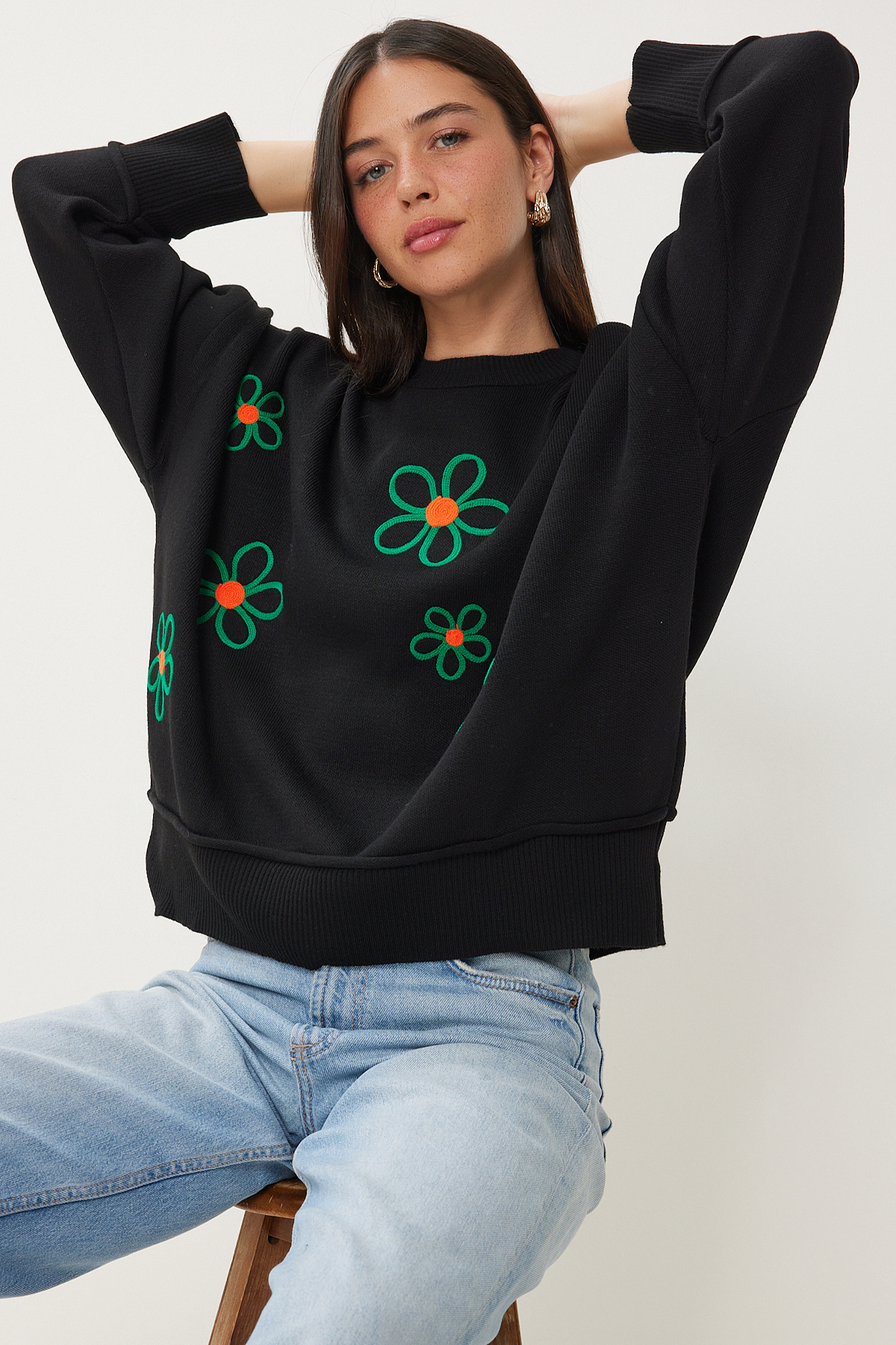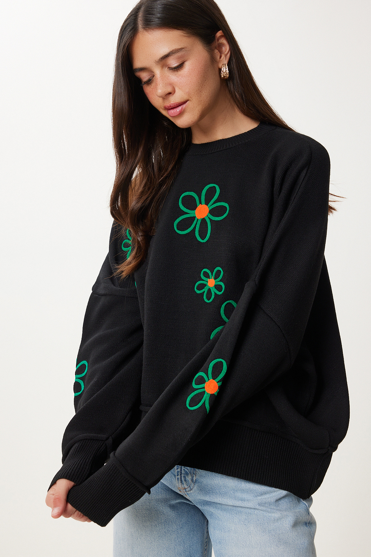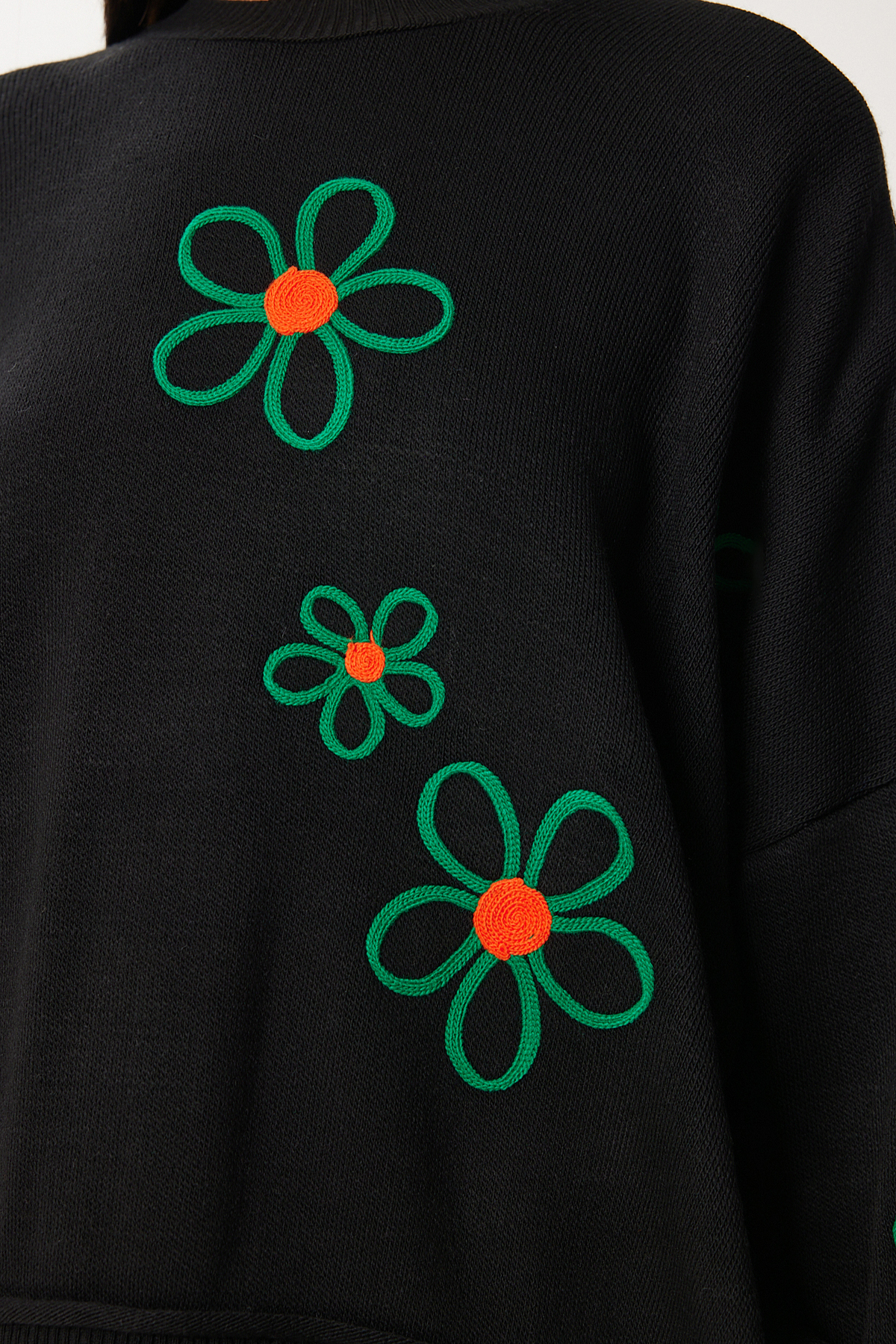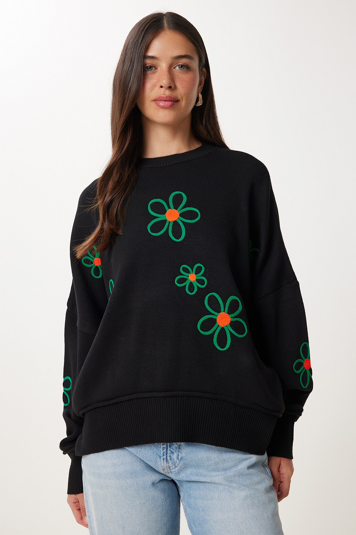 Bisiklet yaka, düşük omuzlu, esnek yapılı, rahat kalıp, çiçek nakışlı, oversize triko kazak
