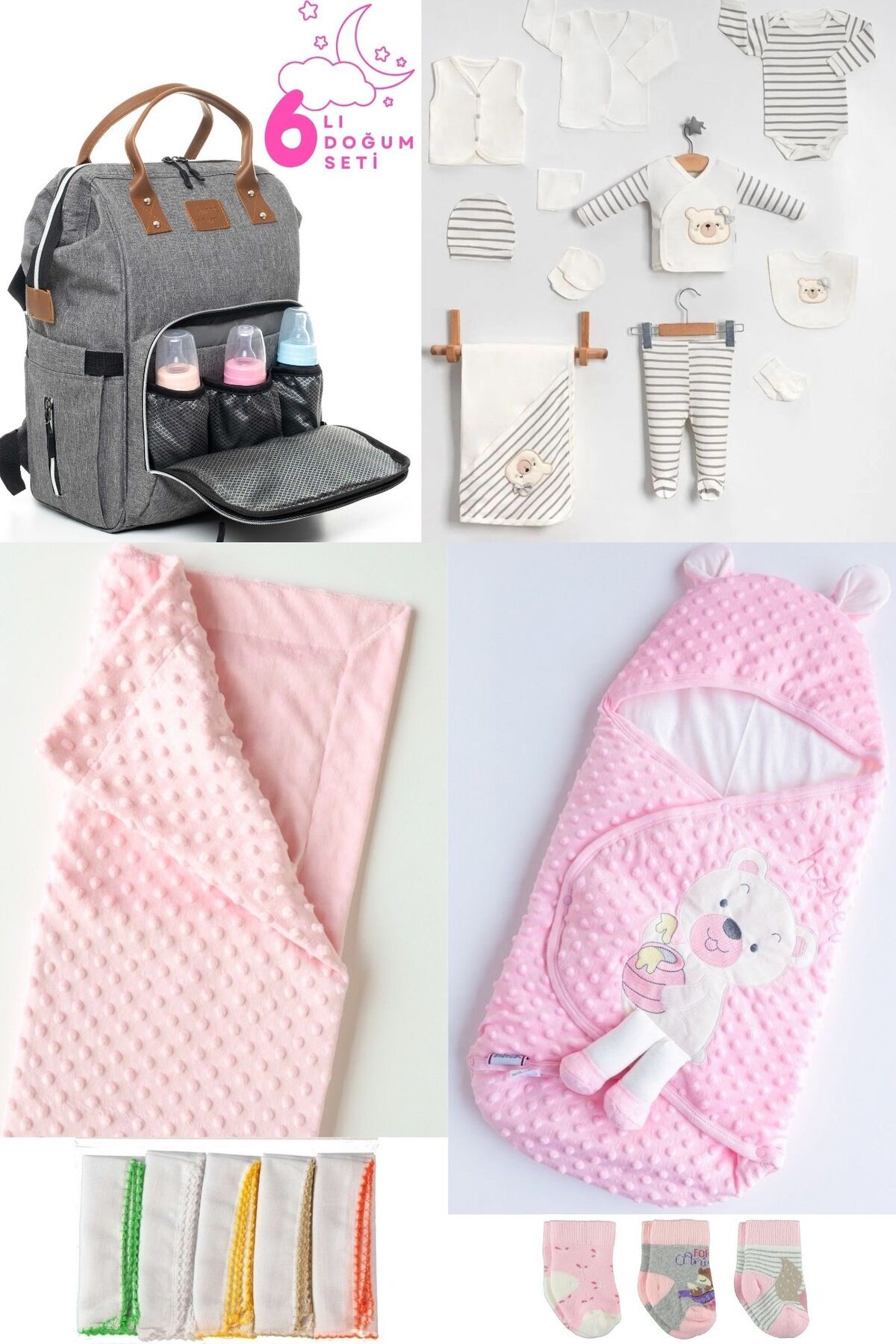 • - 5 parçadan oluşan set içeriği ile hastane çıkışında ihtiyacınız olan tüm temel ihtiyaçları karşılar.