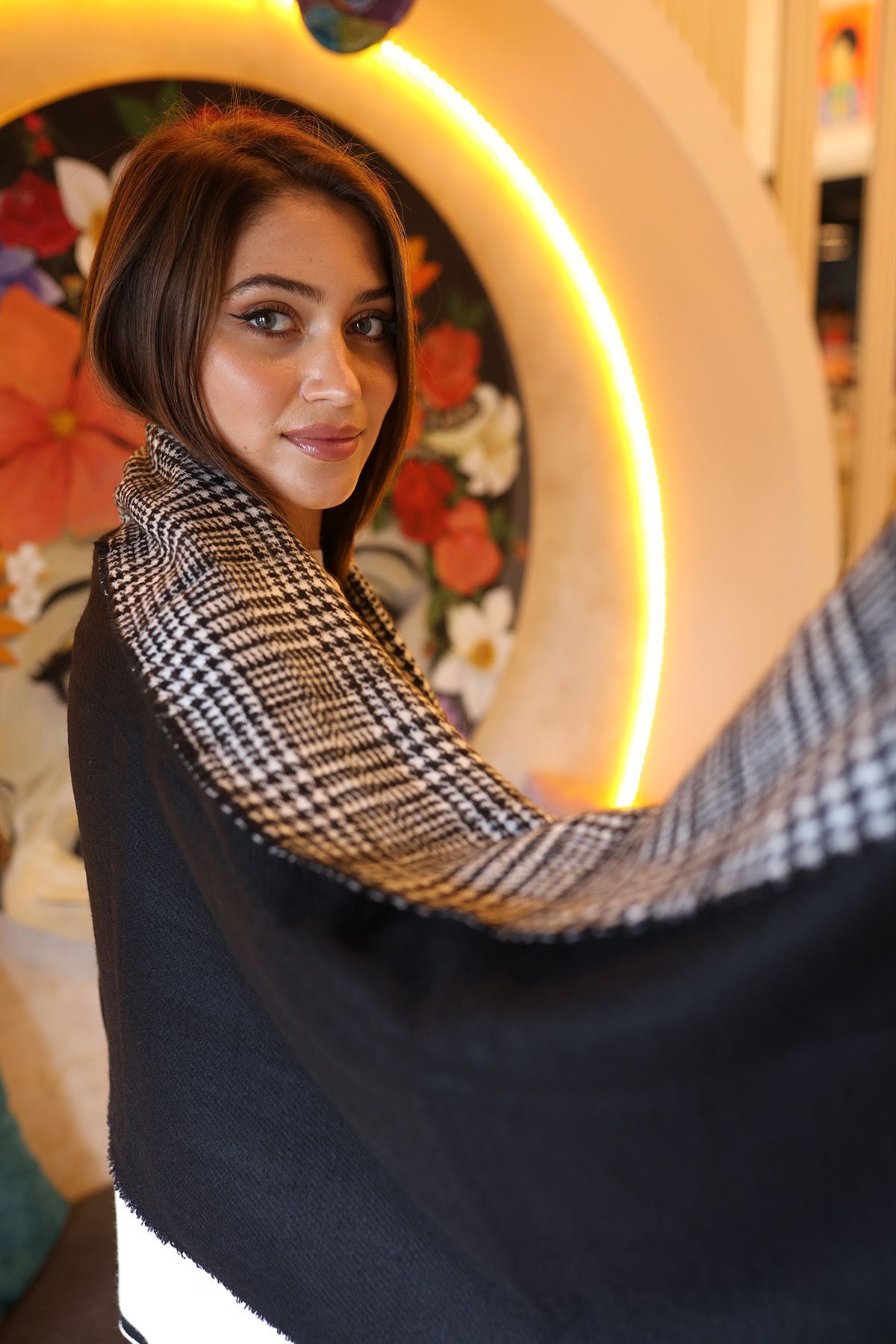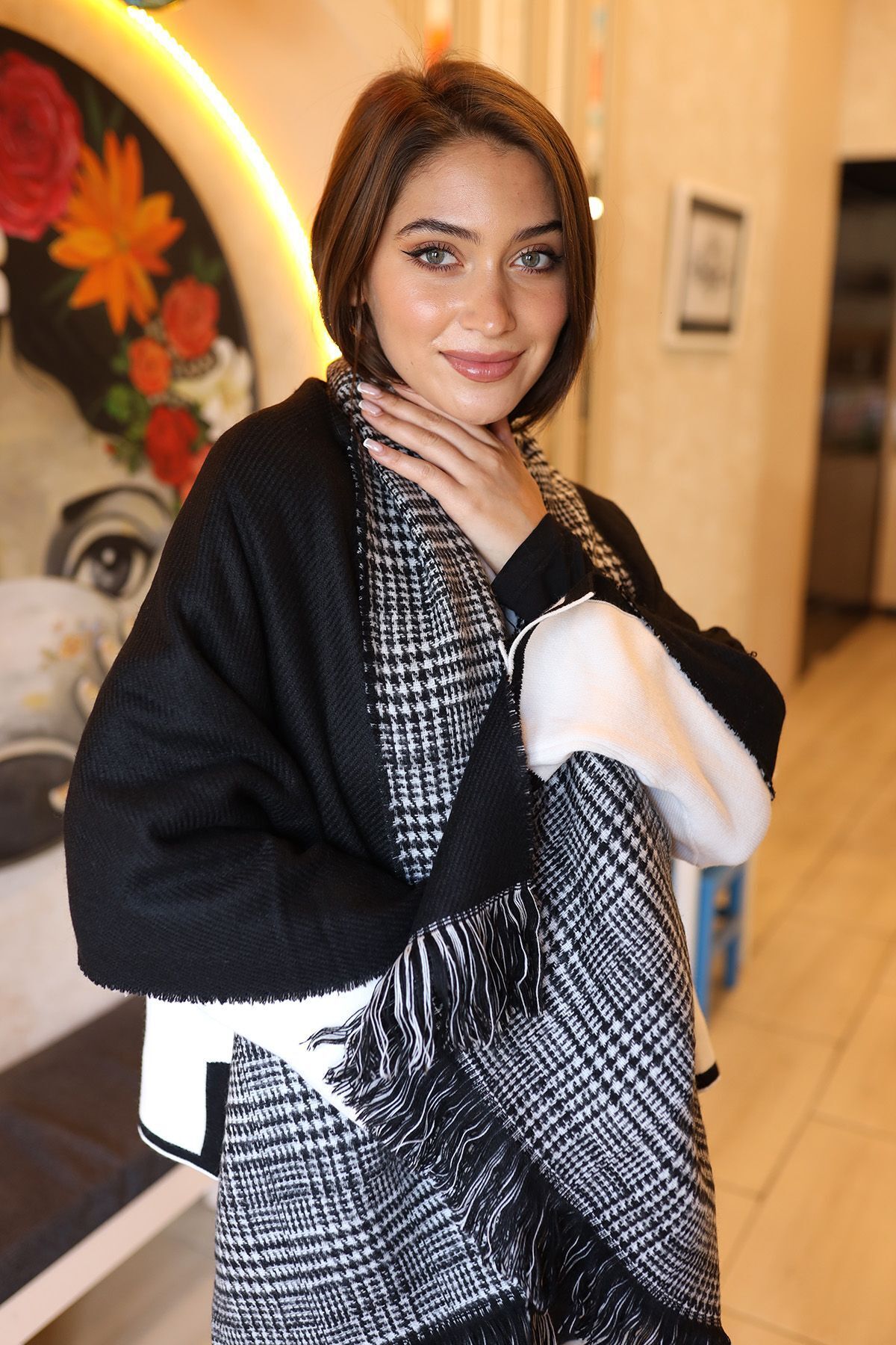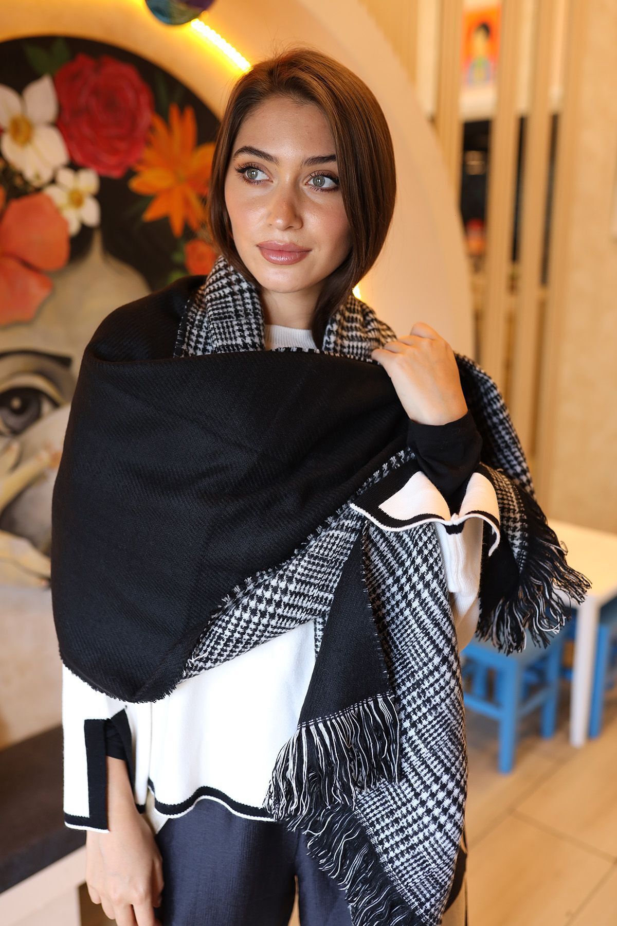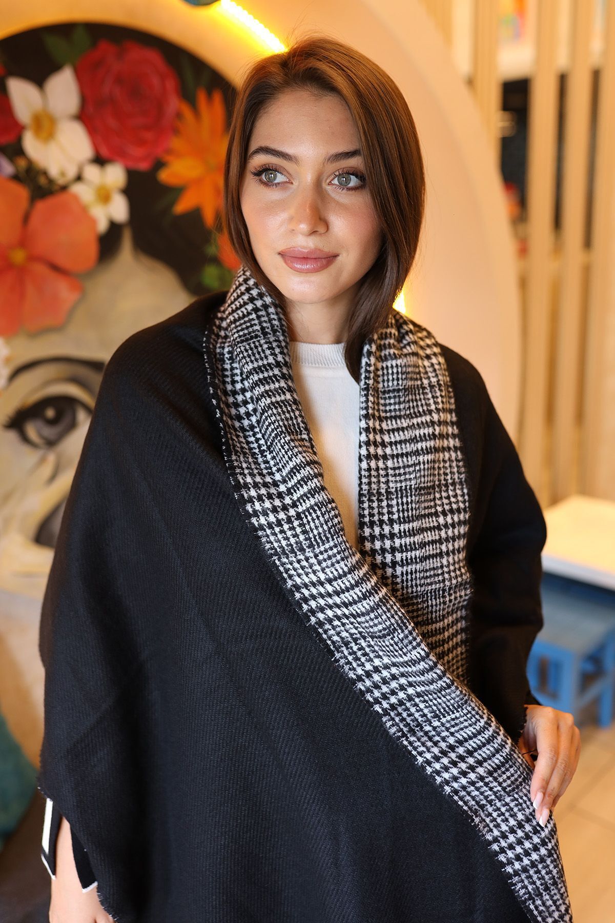 - Çift taraflı kullanım özelliği ile hem atkı hem de omuz şalı olarak kullanılabilen pratik tasarım.