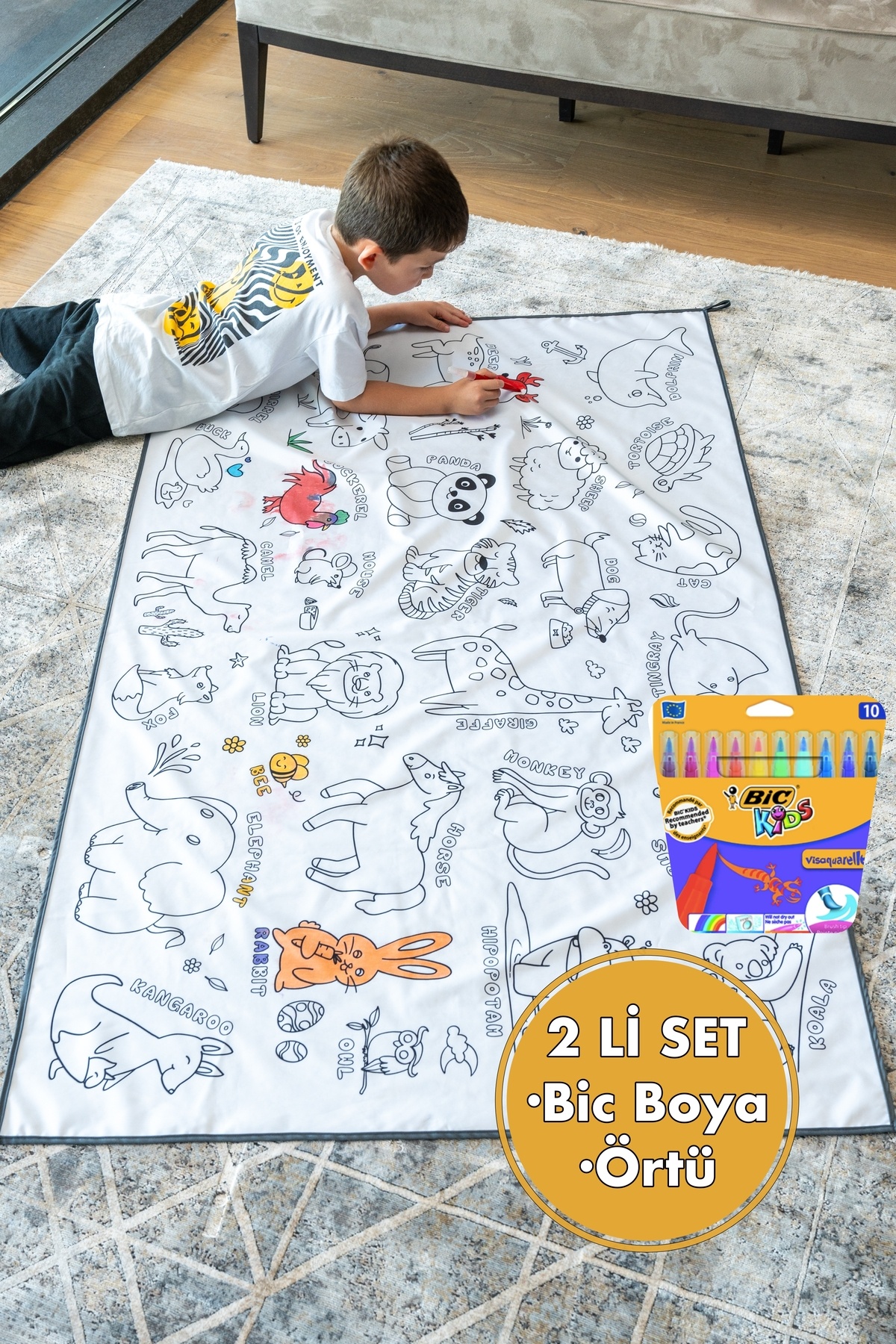 Çocuklarınızın hayal dünyasını canlandırmak ve el yeteneklerini, üreticiliğini özgürce ifade etmelerine olanak tanımak için tasarlanmış boyama örtüsü seti ile tanışın! Bu özel seti 100cm x 150cm boyutlarındaki özel olarak formüle edilmiş zemine su ve boya geçirmez örtü boyama sonrası makinada yıkanabilir. Yıkama sonrası temiz yüzey ile yeniden boyanabilir.