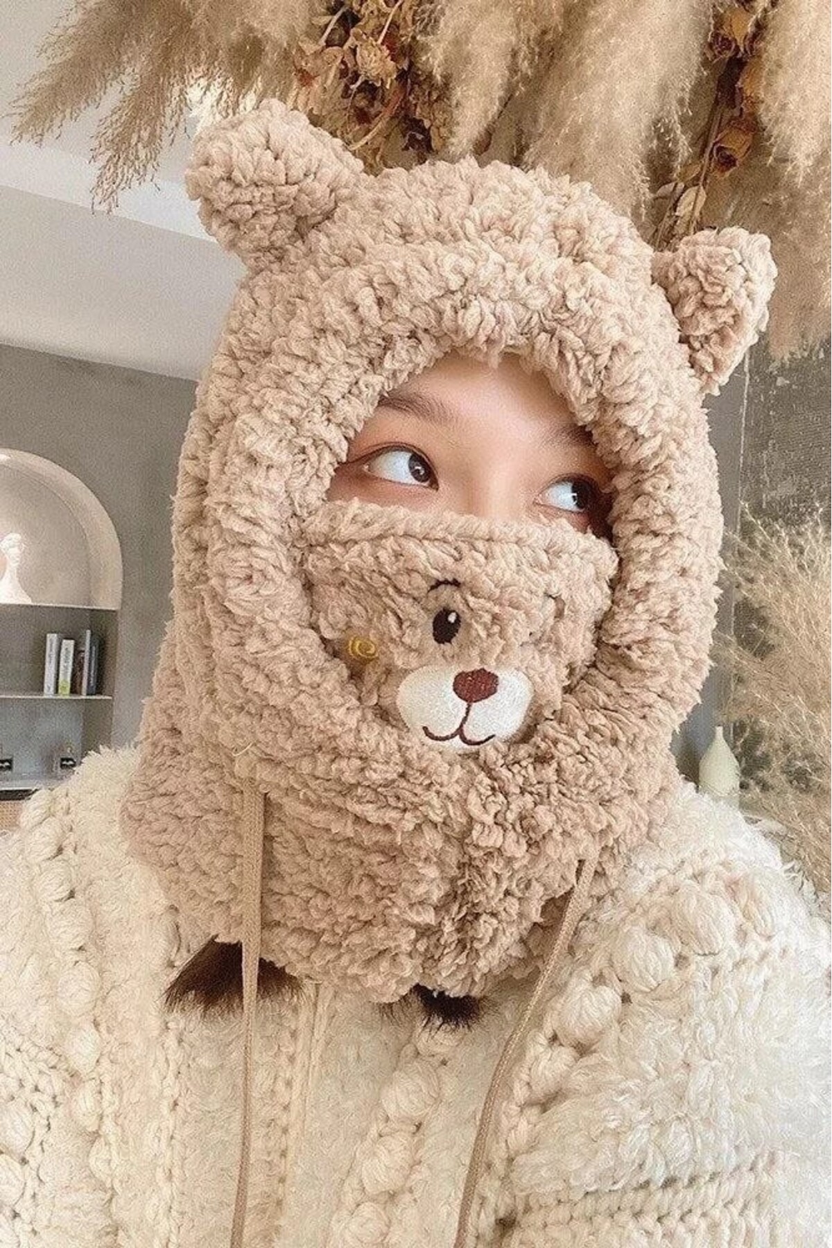 Bej rengi ve ayıcık detayları ile hem kız hem de erkek çocuklar için uygun, zamansız bir aksesuar seçeneği oluşturur