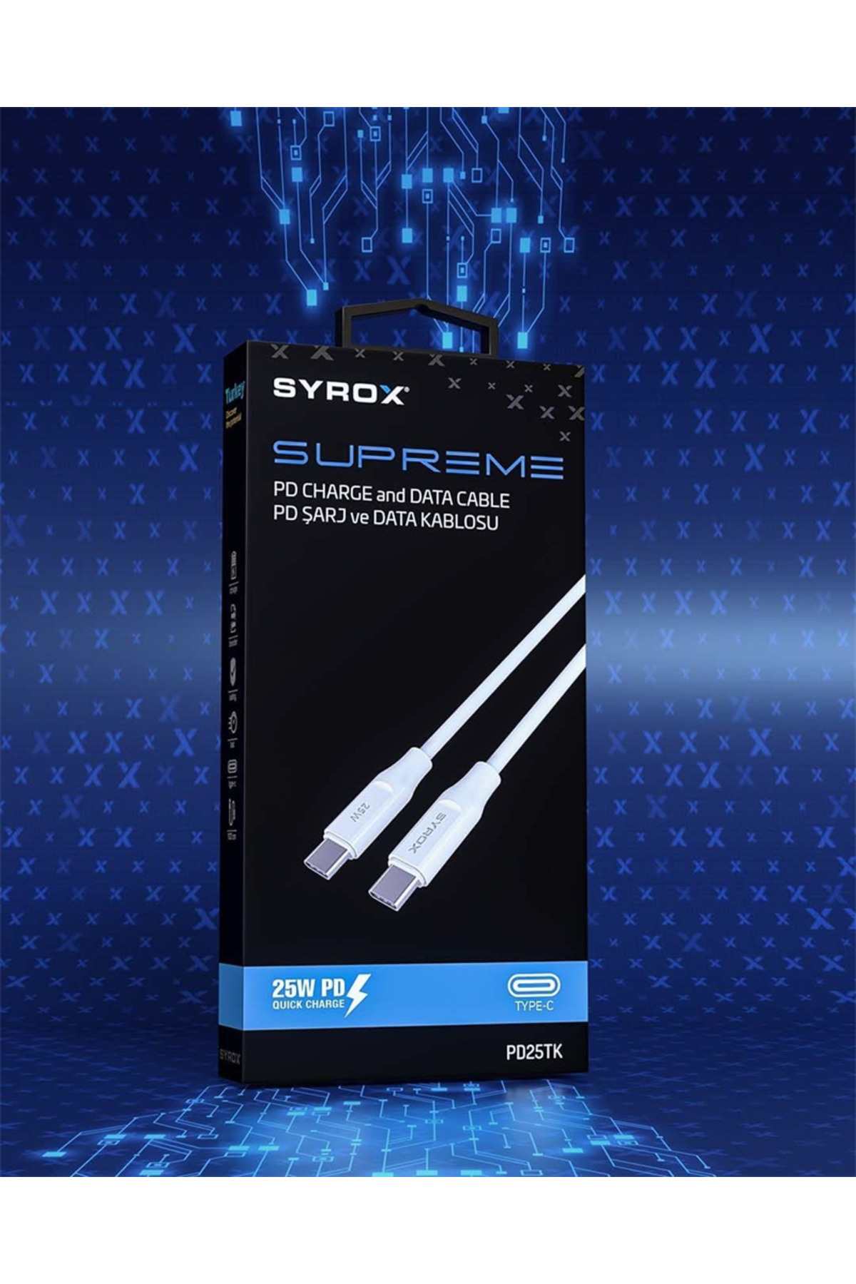 Syrox PD25TK Type-C to Type-C PD 25W Hızlı Data/Şarj Kablosu 1mt Marka: Syrox Model: SYX-PD25TK Çıkış / Güç: 25W PD A Ucu: Type-C B Ucu: Type-C Materyal: TPE (Yuvarlak) Renk: Beyaz Uzunluk: 1 Metre (100 cm) Özellik: Güvenli hızlı şarj ve veri senkronizasyonu Kullanım Alanları: Type-C girişli cihazlarda şarj ve veri alışverişi • Type-C (USB-C) girişli cihazlar için 25W destekleyen şarj kablosu • Powerbank veya ev / oto şarj aletlerinde gerçek hızlı şarj için kullanılabilir • Aynı zamanda veri transferi ve senkronizasyon için kullanılabilir • Aşınma ve kopmaya dayanıklı TPE kaplama malzeme, yuvarlak tip