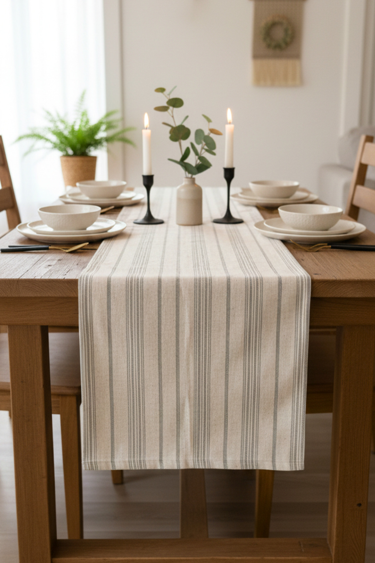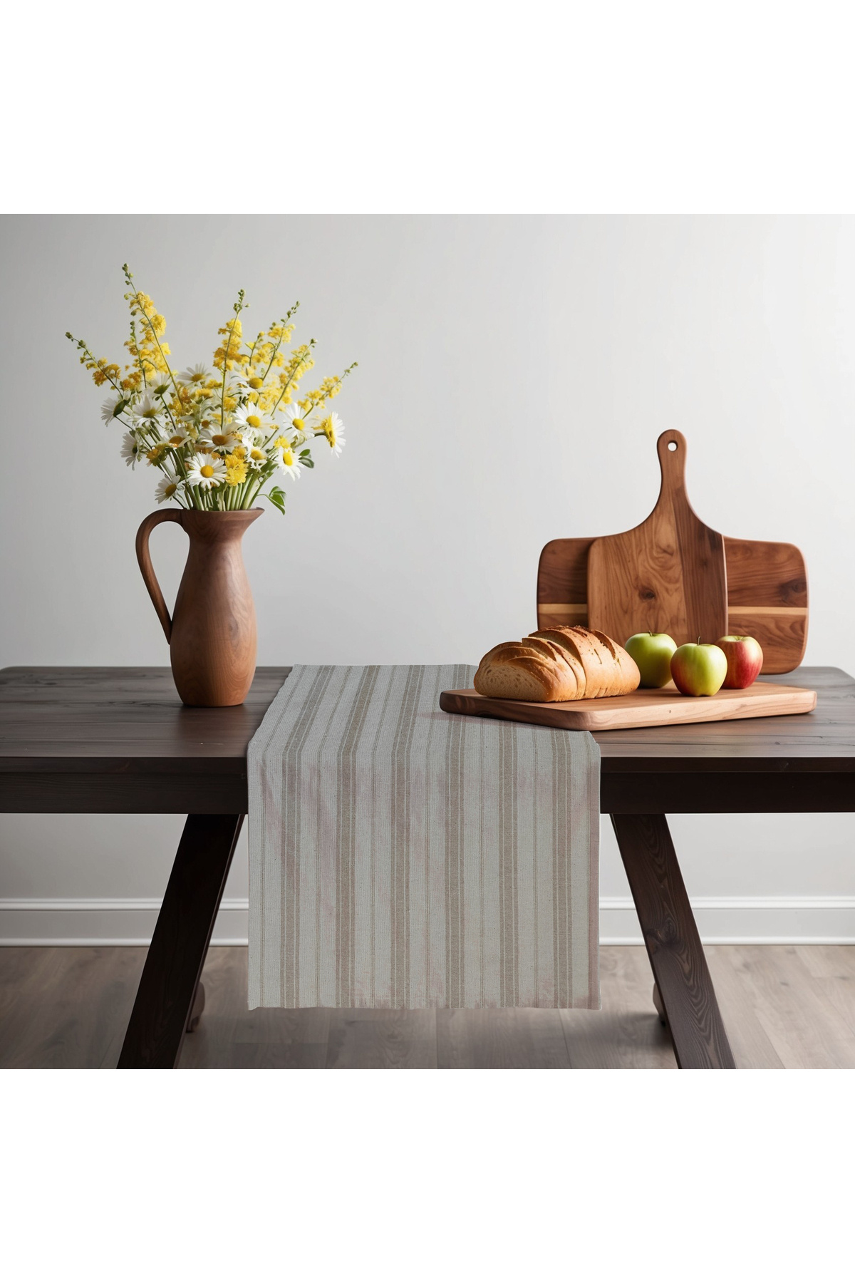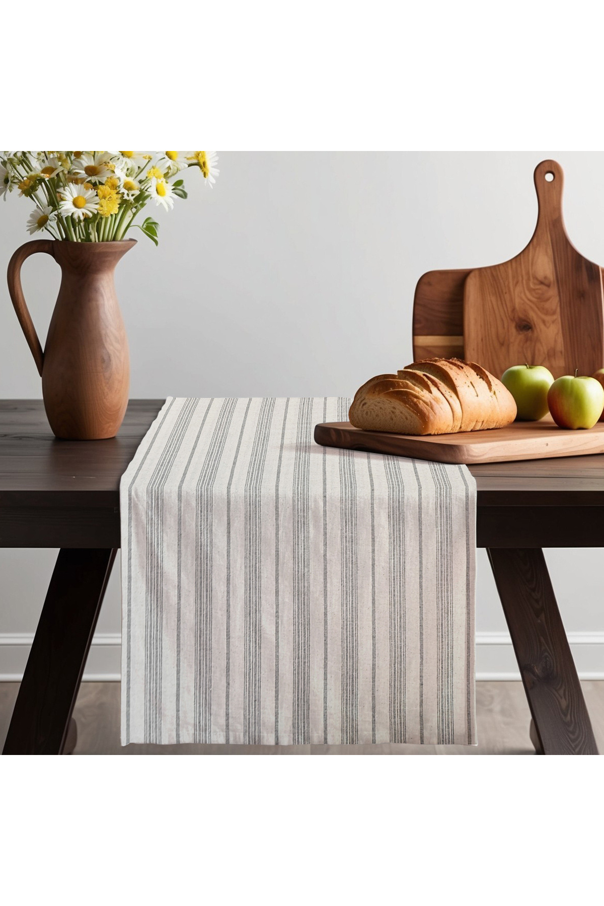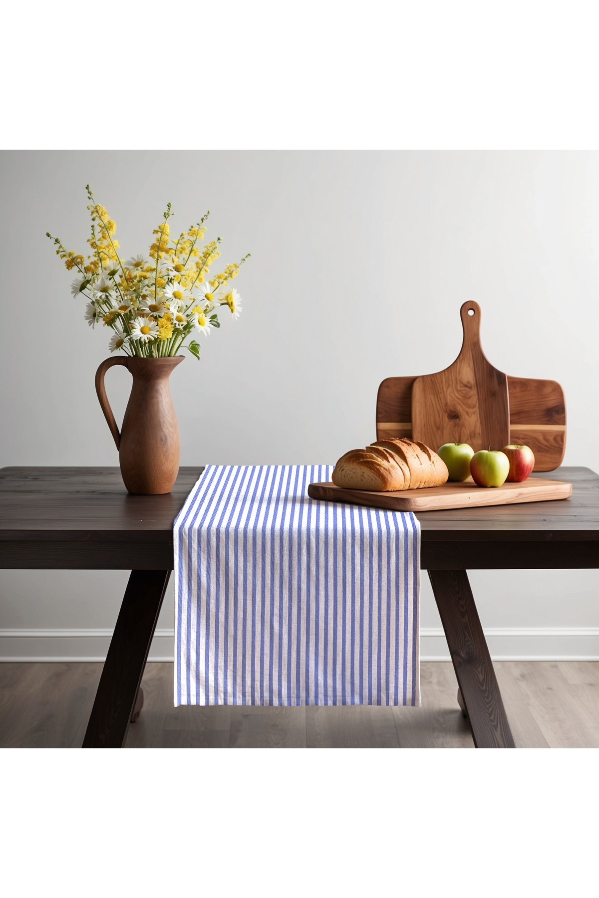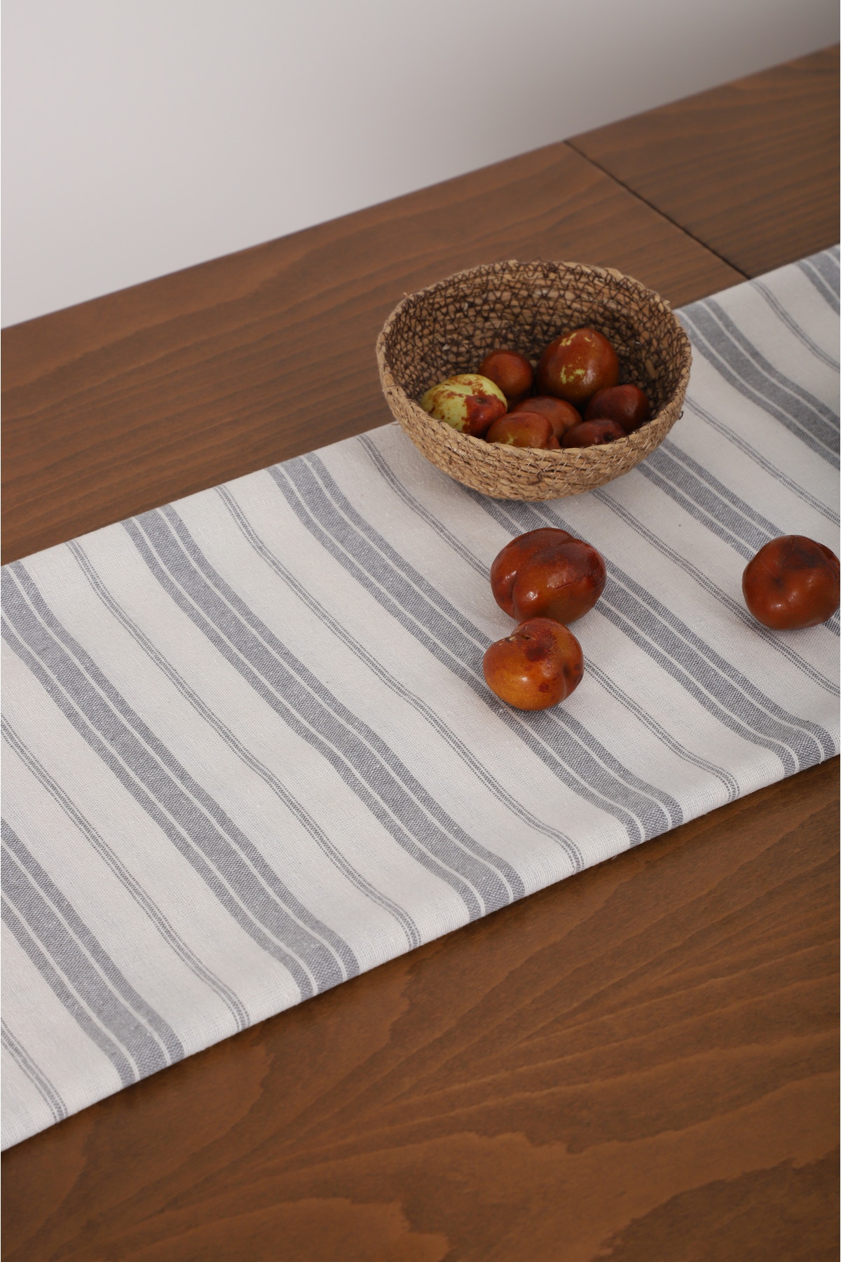 - Modern ve şık tasarımıyla dikkat çeken ince çizgili pamuk keten runner, 40x150 cm boyutlarındaki zarif formuyla sofralarınıza estetik bir dokunuş katıyor.