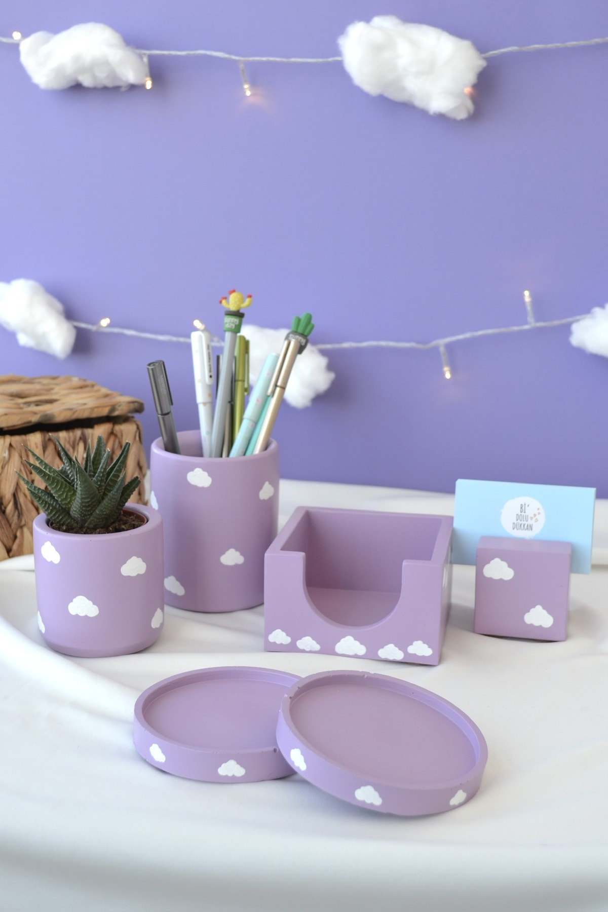 Bulutları masana taşı! İçeriğinde neler var? 1 tane kalemlik 1 tane bloknotluk 1 tane kartvizitlik 1 tane saksı 1 tane sukulent 2 tane bardak altlığı Ürünlerimizi çimento esaslı model harcı ile üretiyoruz.