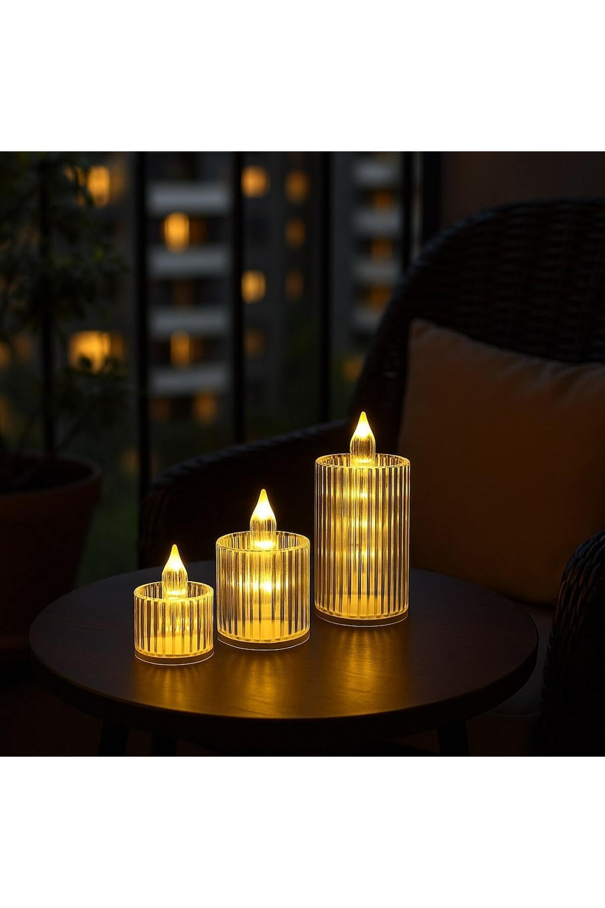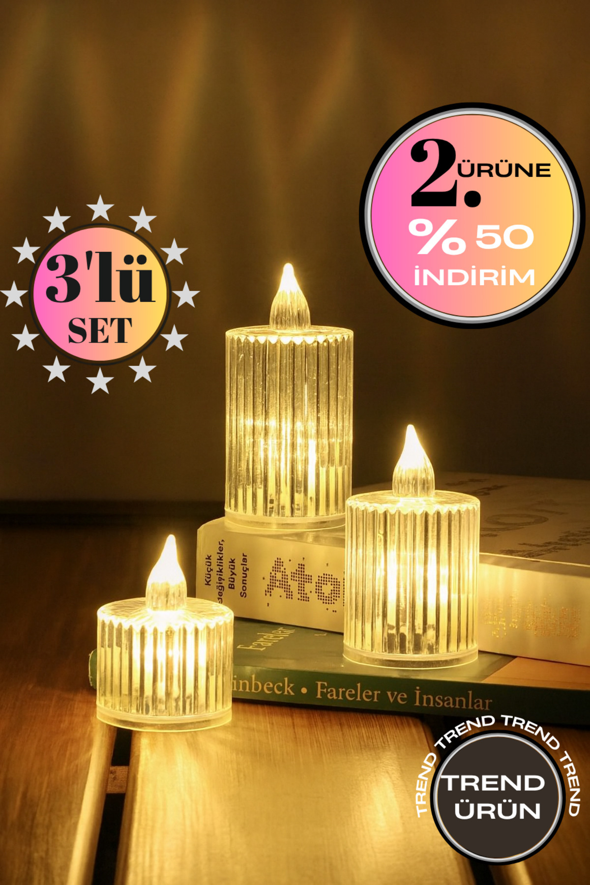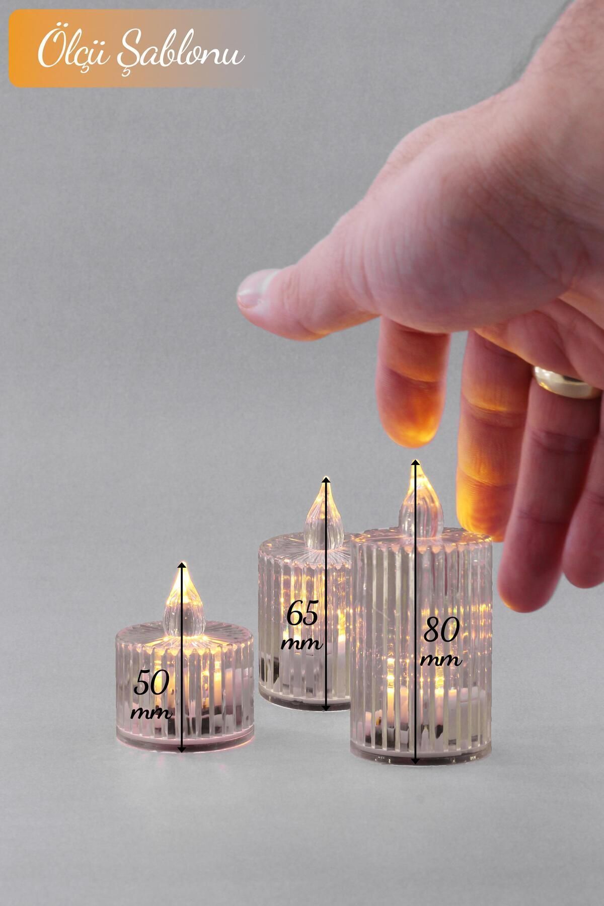 - Üç adet şeffaf ve kristal desenli led mum seti, evinizin dekorasyonuna zarif bir dokunuş ekler.