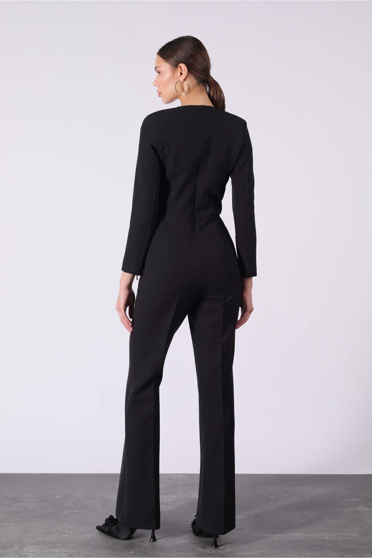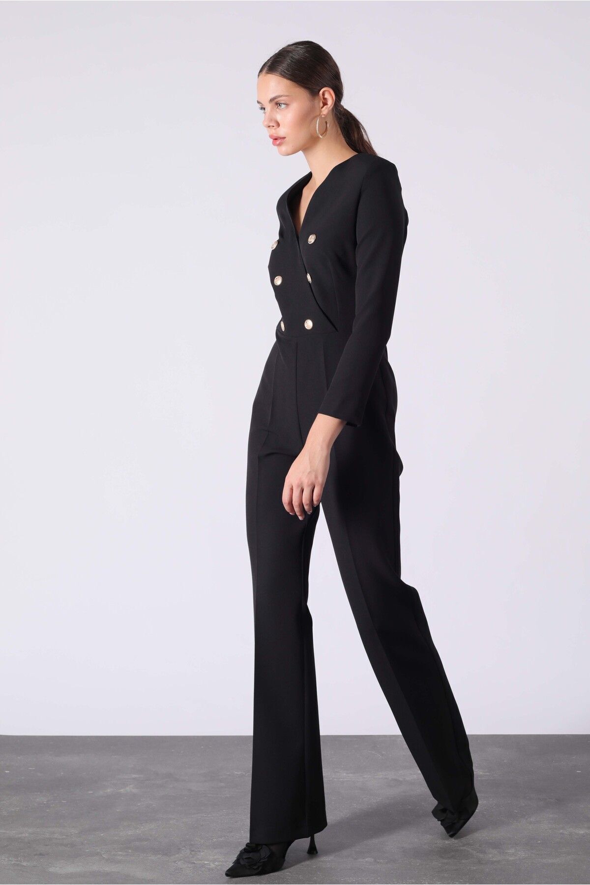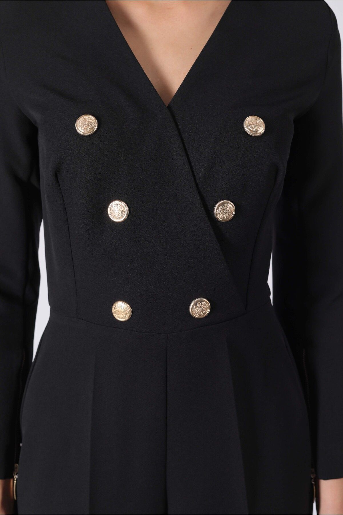 Yake Gold Düğmeli Kruvaze Kolu Fermuar Detaylı Siyah Tulum ile her adımınızda zarafet saçın.