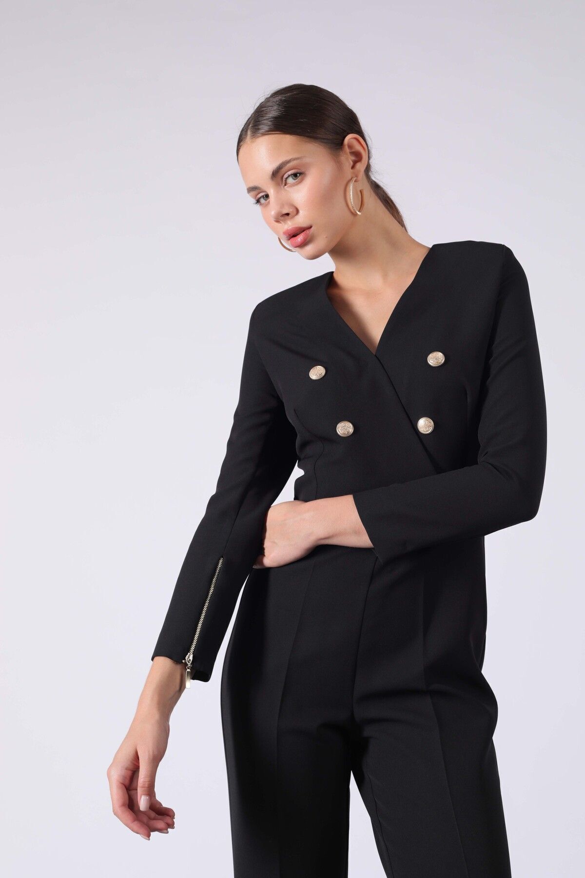 Şıklığın ve modernliğin simgesi Yake Gold Düğmeli Kruvaze Kolu Fermuar Detaylı Siyah Tulum ile tarzınızı öne çıkarın.
