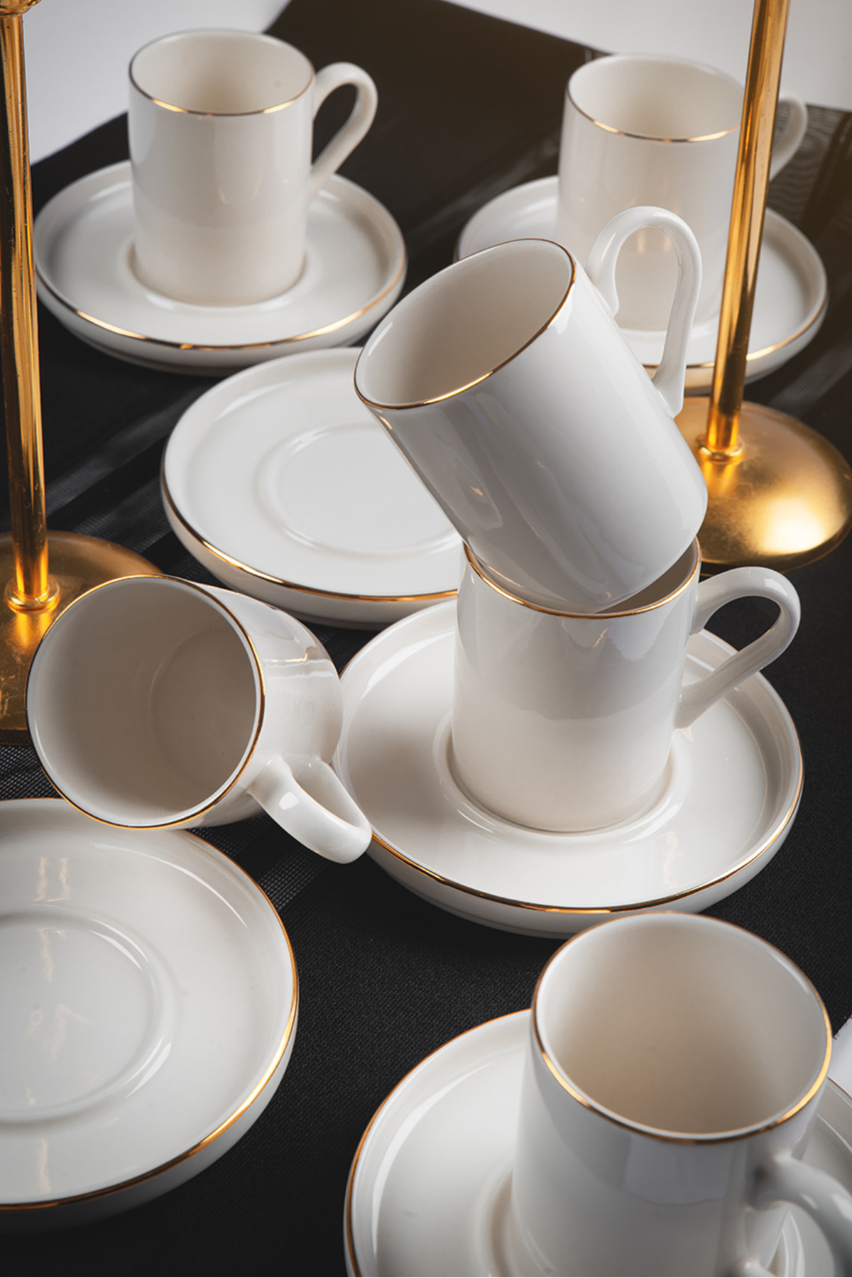 Kitchen Life 12 Parça 6 Kişilik Altın Yaldızlı Kahve Fincan Seti 6 Adet Kahve Fincanı 6 Adet Kahve Altlığı Bone China Porselenden Daha ince ve Daha Kaliteli bir Malzemedir. Daha estetik Daha Sert ve Kırılması Zordur. Daha pürüzsüzdür