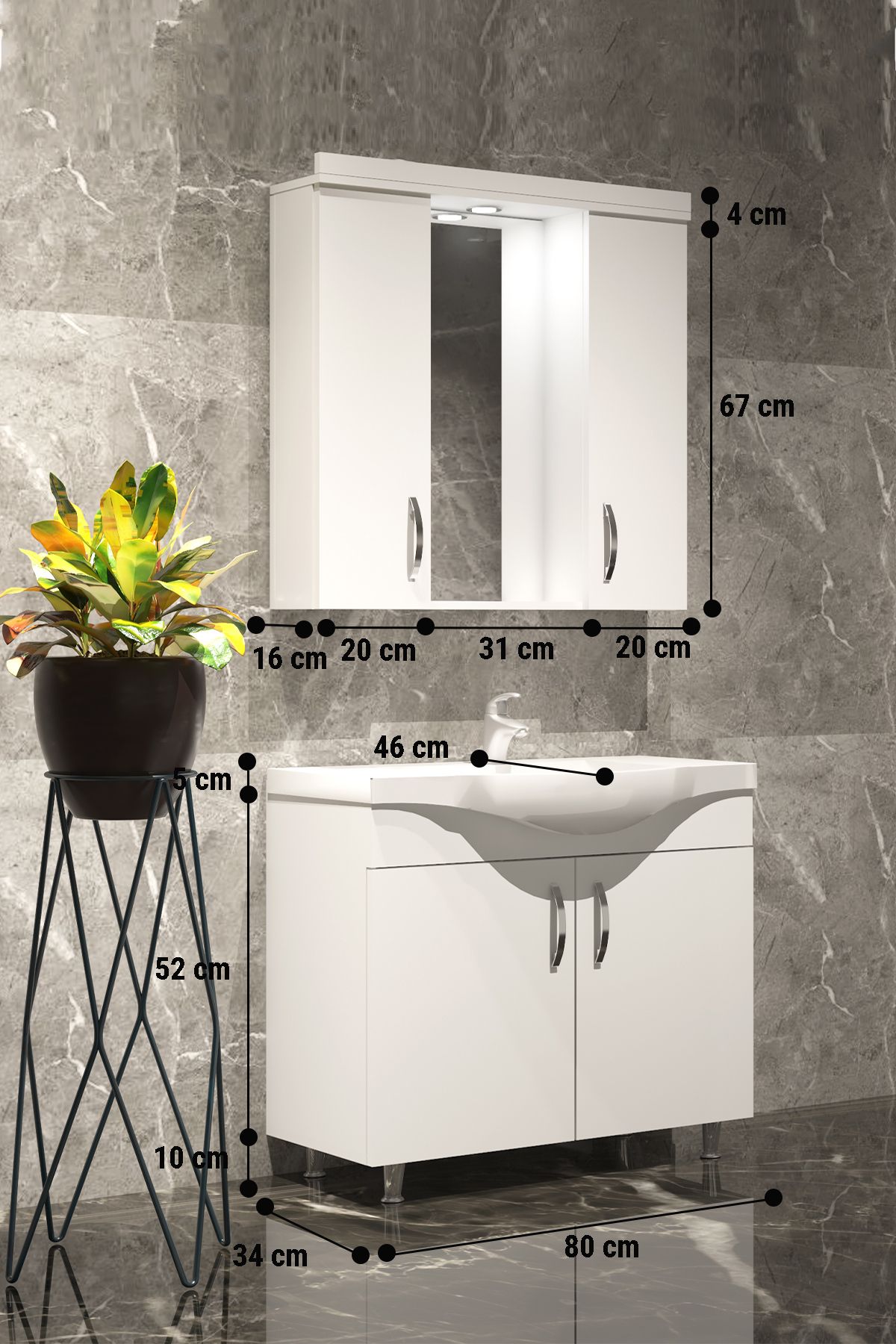 ALT DOLAP ÖLÇÜLERİ: EN: 80 cm BOY: 57 cm + 10 cm (Ayak) DERİNLİK: 34 cm (Lavabo Dahil : 46 cm)