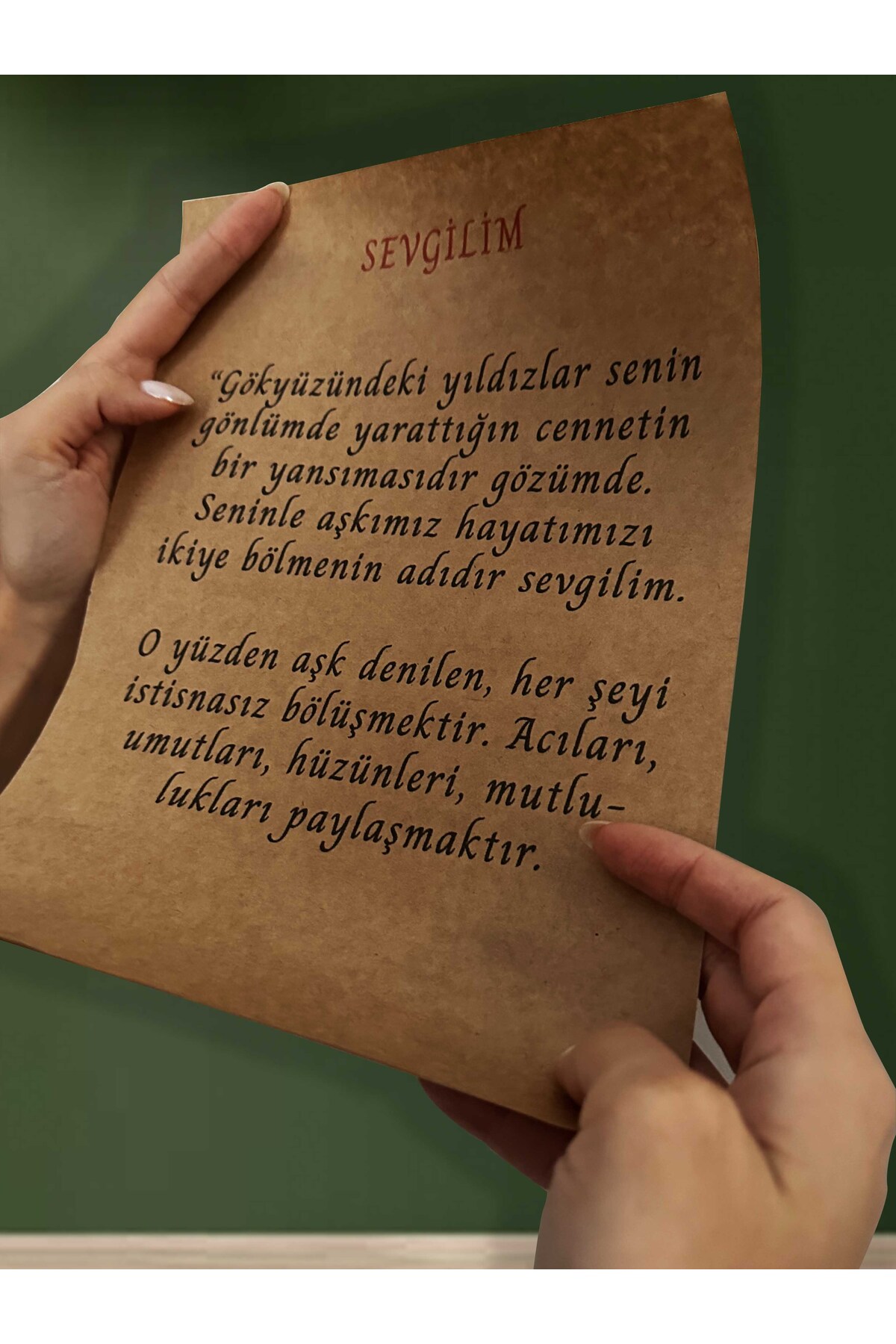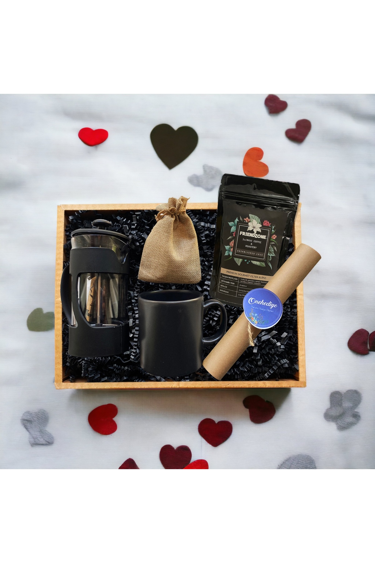 1 Adet içerisine dilediğinizi uzun uzun yazabileceğiniz bir mektup kağıdı 1 adet french press 1 adet siyah kupa 1 adet filtre kahve 1 adet kese lokum Özel hediye kutusunda gönderilir.