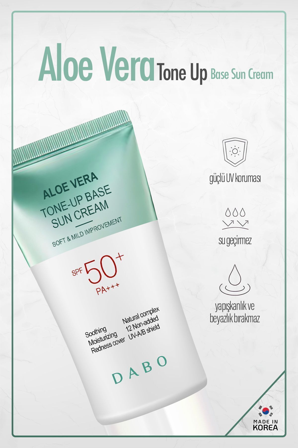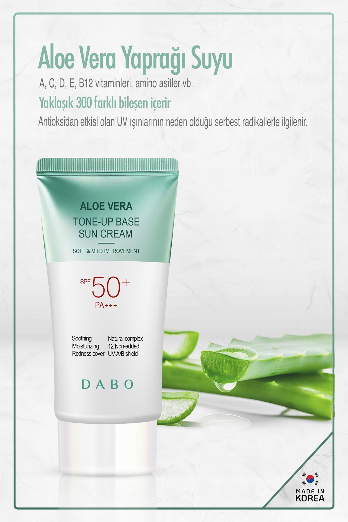 Dabo Aloe Vera Tone Up Base Güneş Kremi, SPF 50+ PA+++ ile geniş spektrumlu güneş koruması sağlamanın yanı sıra cilt tonunu aydınlatıp eşitleyen bir baz görevi gören çok işlevli bir güneş kremidir.