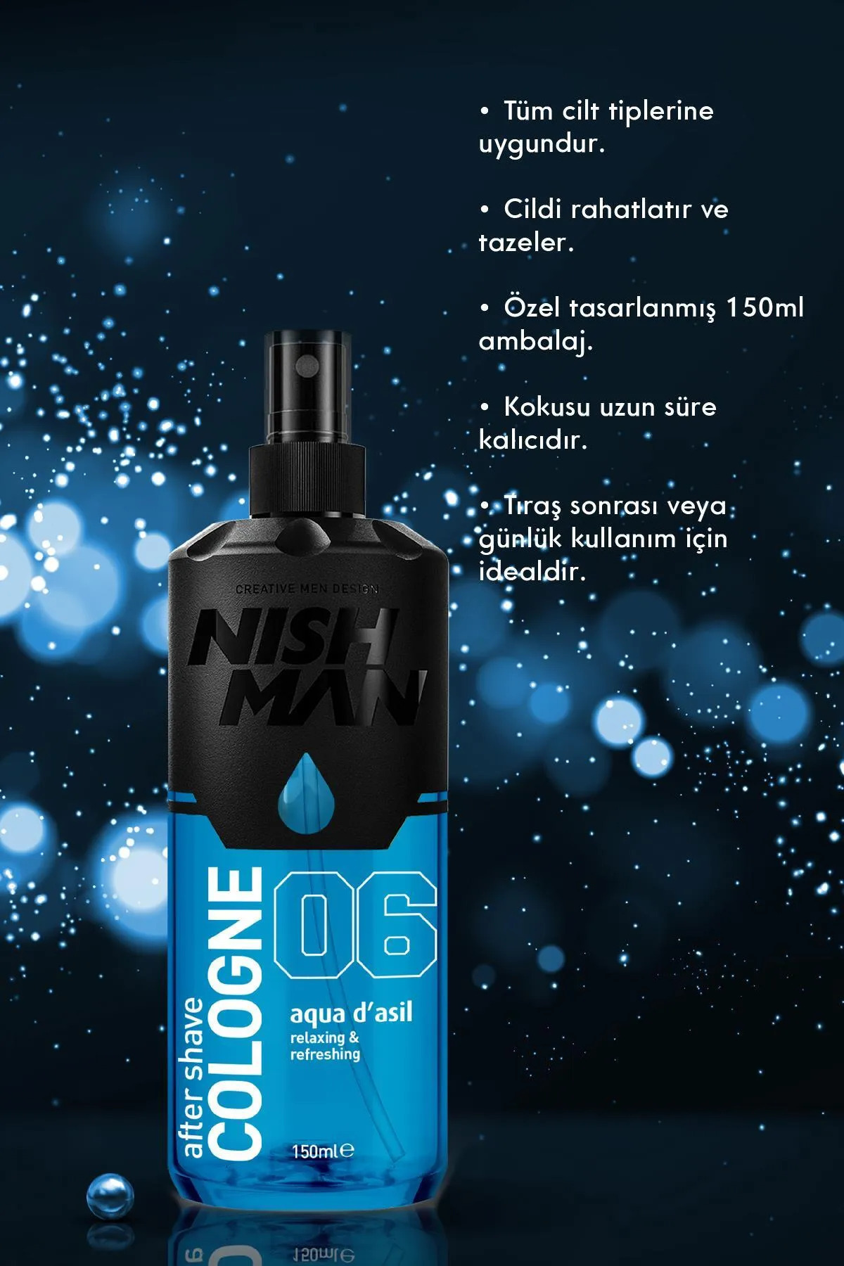 NISHMAN Tıraş Sonrası Kolonya Aqua D’asil No6 Special Edition (150 ml), tıraş sonrası veya günlük kullanım için mükemmel bir tercihtir Kendine özgü şişesi ve ferahlatıcı formülüyle, el ve yüz bölgenize uygulayabileceğiniz bu özel kolonya, gün boyu kalıcı bir ferahlık ve tazelik hissi sunar Üst notalarında bergamot ve deniz esintileriyle canlanırken, orta notalarda biberiye, turnagagası ve adaçayı ile dengelenir Alt notalarda ise güçlü odunsu kokular, balzamik dokunuşlar, misk, etkili paçuli ve tütsünün uyumuyla benzersiz bir koku deneyimi yaşatır Cildinizle mükemmel bir uyum yakalayan bu kolonya, tazeleyici etkisi ve uzun süre kalıcı kokusuyla her an yanınızda Ürün Özellikleri • Tüm cilt tiplerine uygundur • Cildi rahatlatır ve tazeler • Özel tasarlanmış 150 ml ambalaj • Kokusu uzun süre kalıcıdır • Tıraş sonrası veya günlük kullanım için idealdir Kullanım Talimatı Tıraştan Sonra: Tıraşınızı tamamladıktan sonra yüzünüzü durulayın ve kurulayın Uygulama: Avucunuza yeterli miktarda kolonya alın Masaj Yaparak Uygulama: Ürünü yüzünüze ve boynunuza nazikçe masaj yaparak uygulayın Ferahlığın Keyfini Çıkarın: Gün boyunca tazelik ve ferahlığın keyfini çıkarın Koku Notaları • Üst Nota: Bergamot, deniz notaları • Orta Nota: Turnagagası, biberiye, adaçayı • Alt Nota: Paçuli, tütsü, odunsu kokular, balzamik, misk