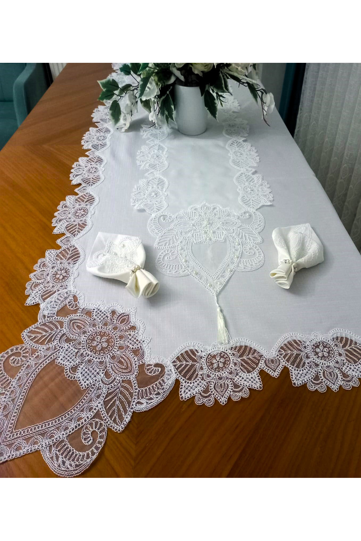 Dantel detayları ile zenginleştirilmiş yarım dantel tasarımı, masanızın şıklığını artırırken aynı zamanda zarafet katar