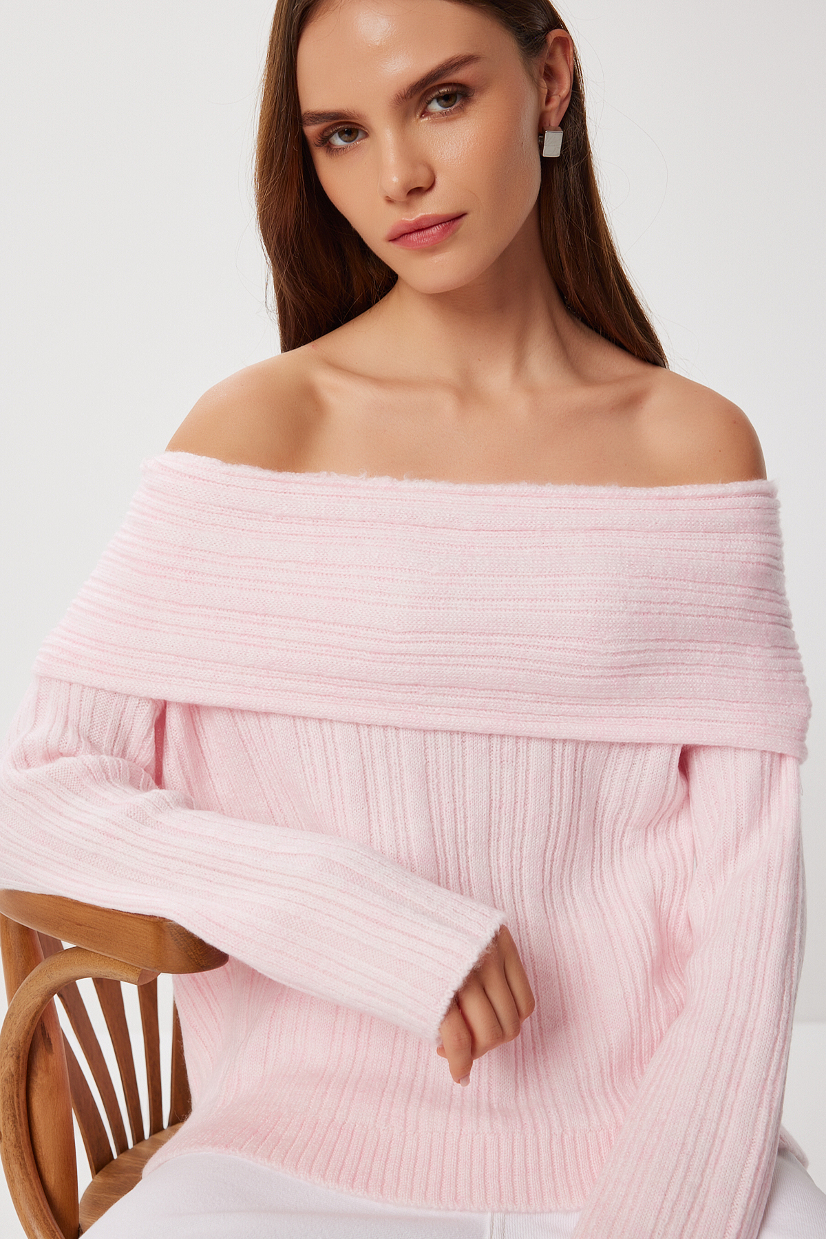 Günlük kullanım için ideal, rahat ve şık bir tasarım sunan gri madonna yaka triko kazak