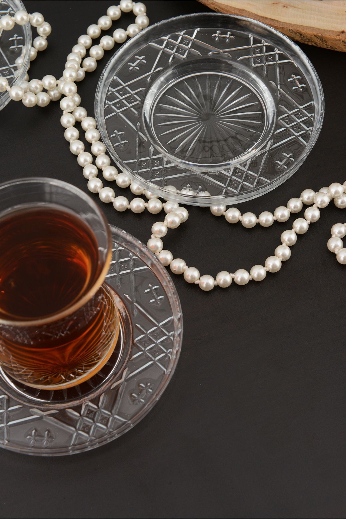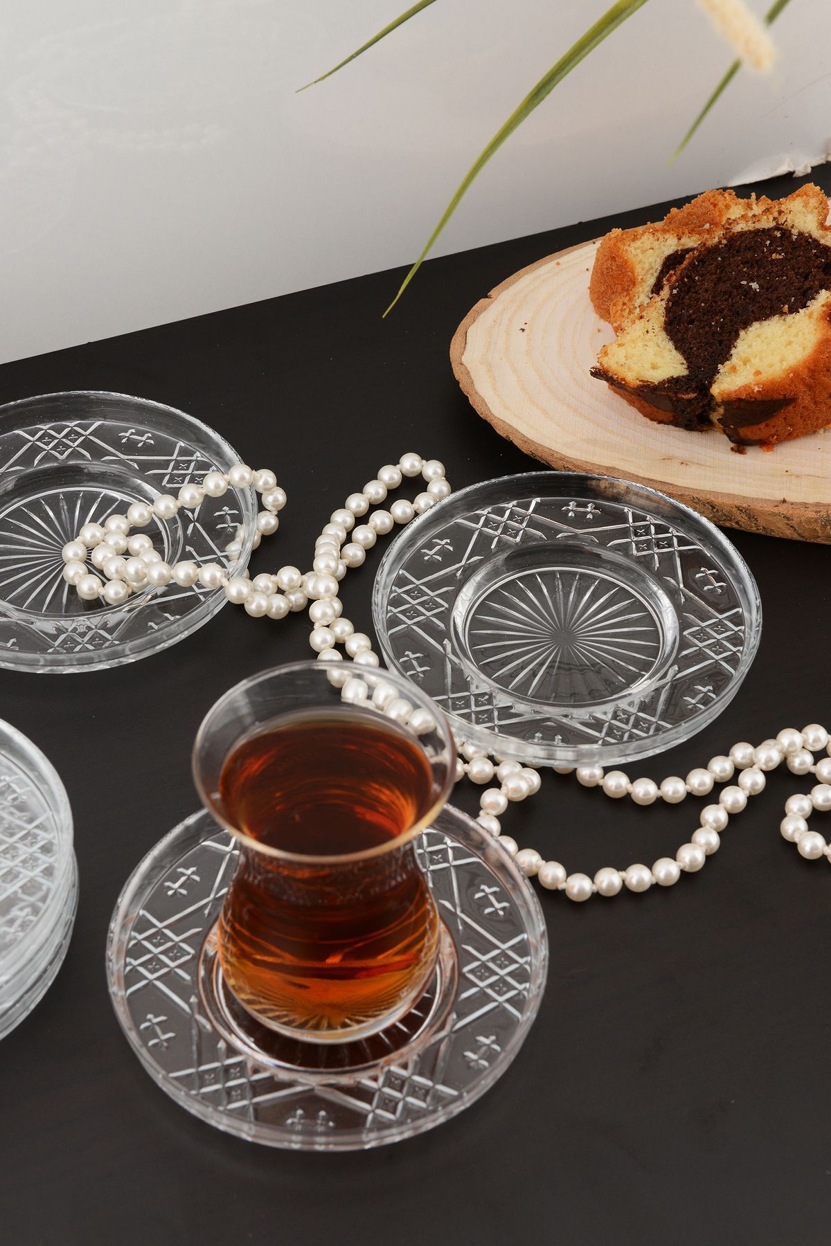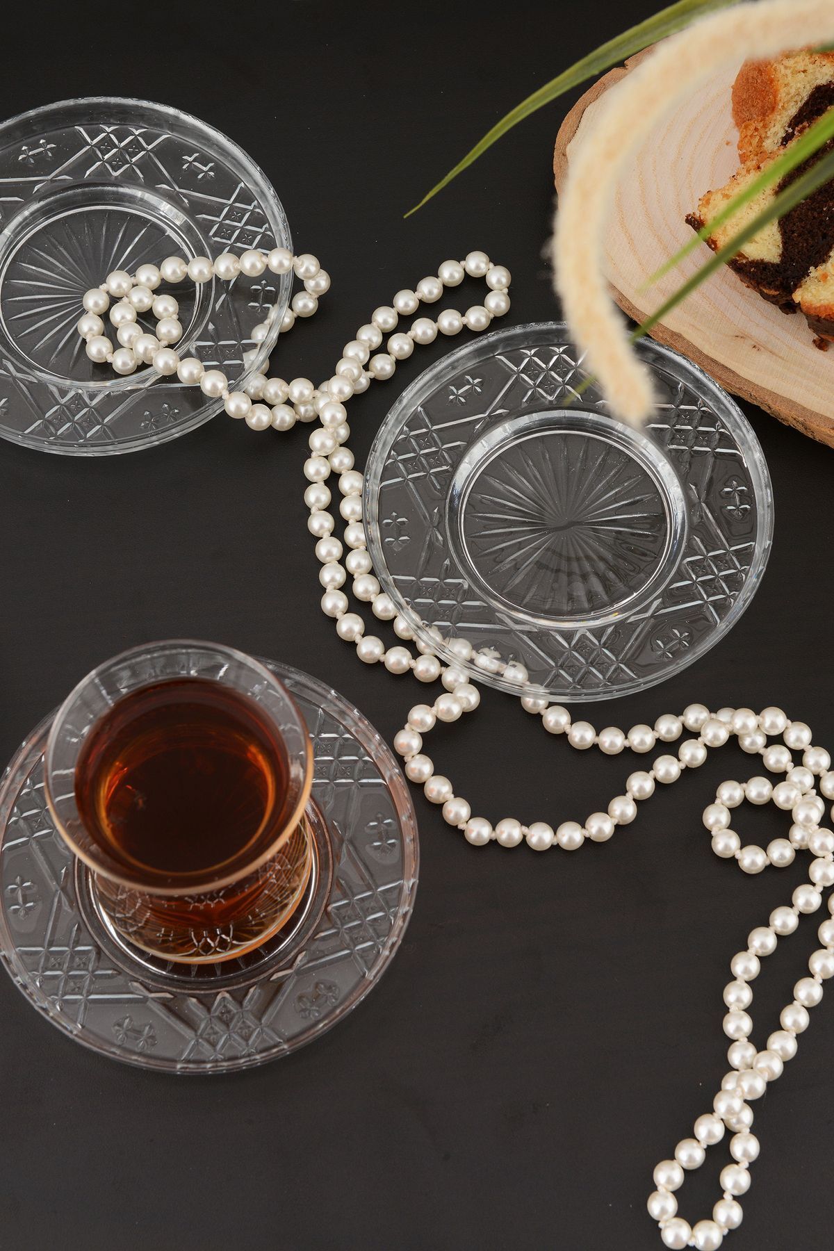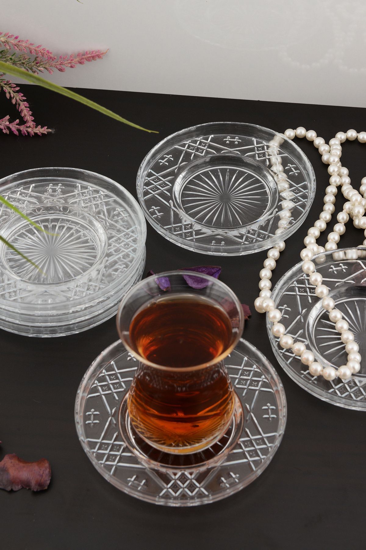Şık ve modern tasarımıyla dikkat çeken Angdesign sedef cam çay tabağı, sofra düzeninize zarif bir dokunuş ekler