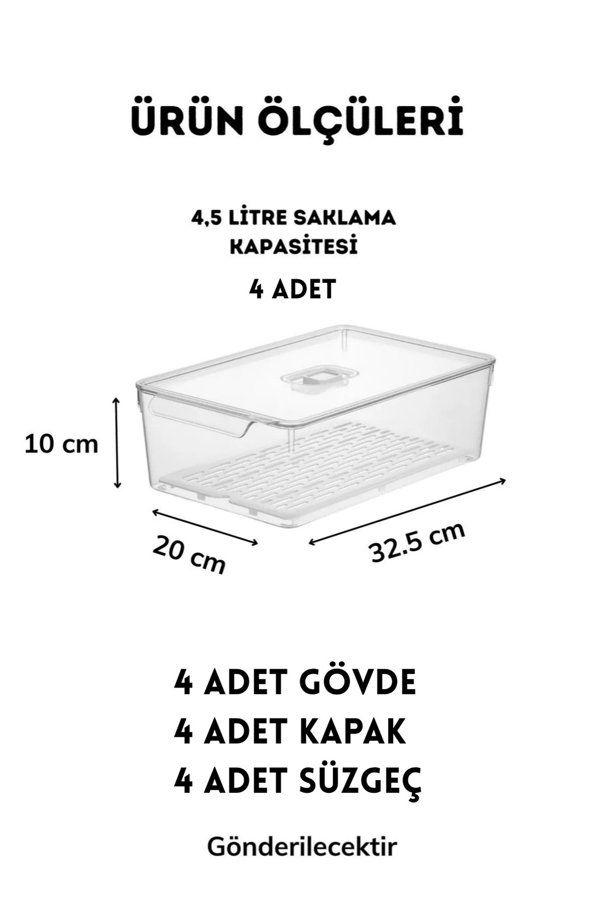 Kutu İçeriği: 4 Adet Aynı Boy Gövde 4 Adet Kapak 4 Adet Süzgeç Toplam 12 Parça Ürün Ölçüleri:1 adeti 20 x 32,5 x 10 cm Ürün Görselinde Ölçü Detayları Mevcuttur.