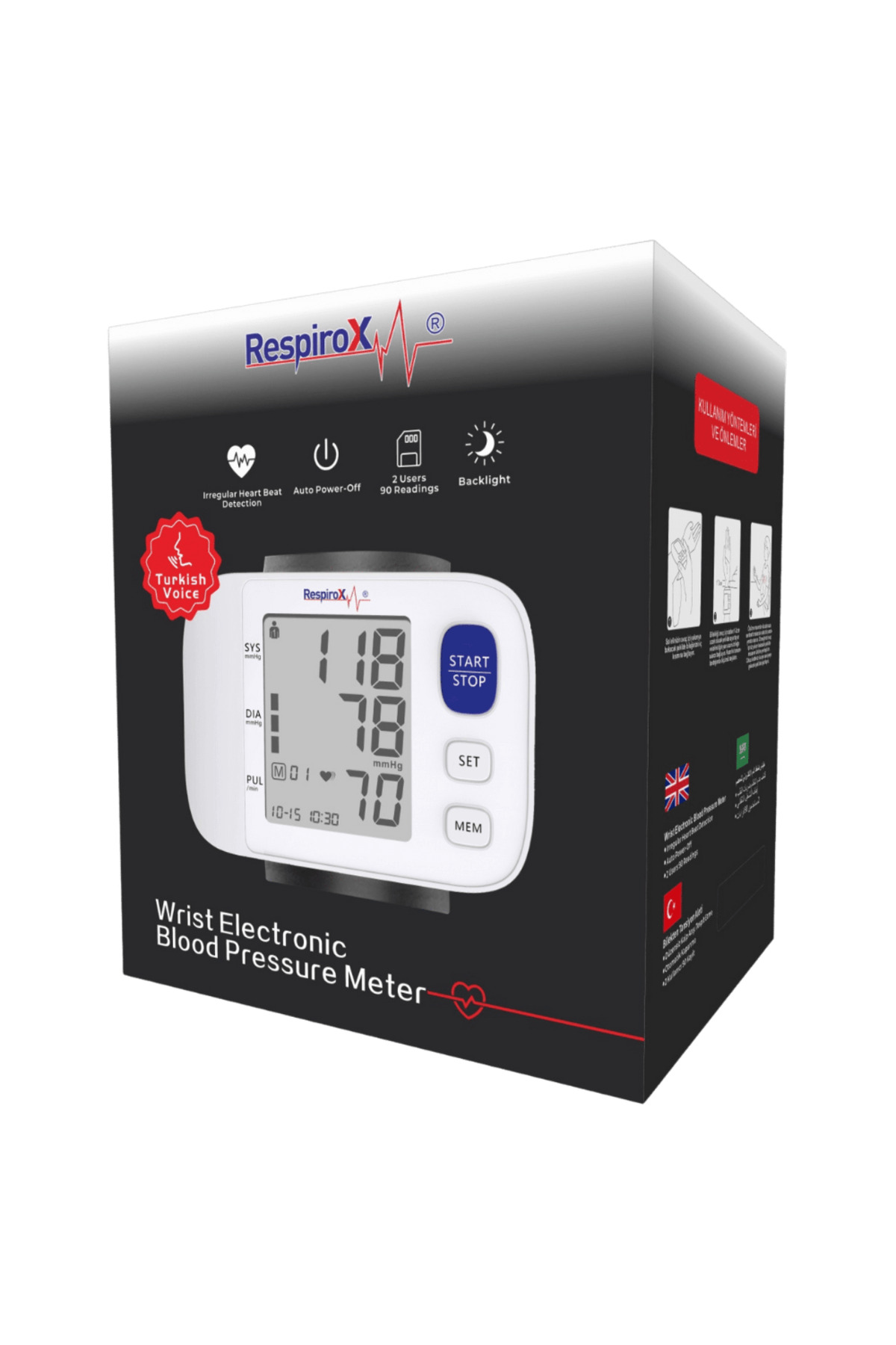 Türkçe Konuşan Bilekten Dijital Tansiyon Aleti JN-163EW Açıklama Güç Kaynağı: 2*AAA boyutunda 1.5 V pil Boyutlar: 40mm x 48mm Ağırlık: 106 gr(pilsiz) Manşon Büyüklüğü: 13.5-19.5 cm Hafıza: Her kullanıcı için maksimum 90 kayıt Güç Tasarrufu: 180 s bekleme ardından otomatik kapanma Basınç Aralığı: 0-260 mmHg Kalp Ritmi Aralığı: 40-180 bpm Sistolik Ölçüm Aralığı: 50 mmHg -250 mmHg Diyastolik Ölçüm Aralığı: 30 mmHg -180 mmHg Nabız Ölçüm Aralığı: 40-180 bpm Maksimum Şişme Basıncı: 260 mmHg Basınç Hassasiyeti: ± 3 mmHg {± 0.4 kPa) Nabız Hassasiyeti: ±%5 Ölçüm Birimi: mmHg / kPa Çalışma Koşulları: 1o°C- 40°C (50°F – 104°F) %15 – %95 bağıl nem Depolama Koşulları: -20°C – 55°C (-4°F – 131°F) %15 – %93 bağıl nem