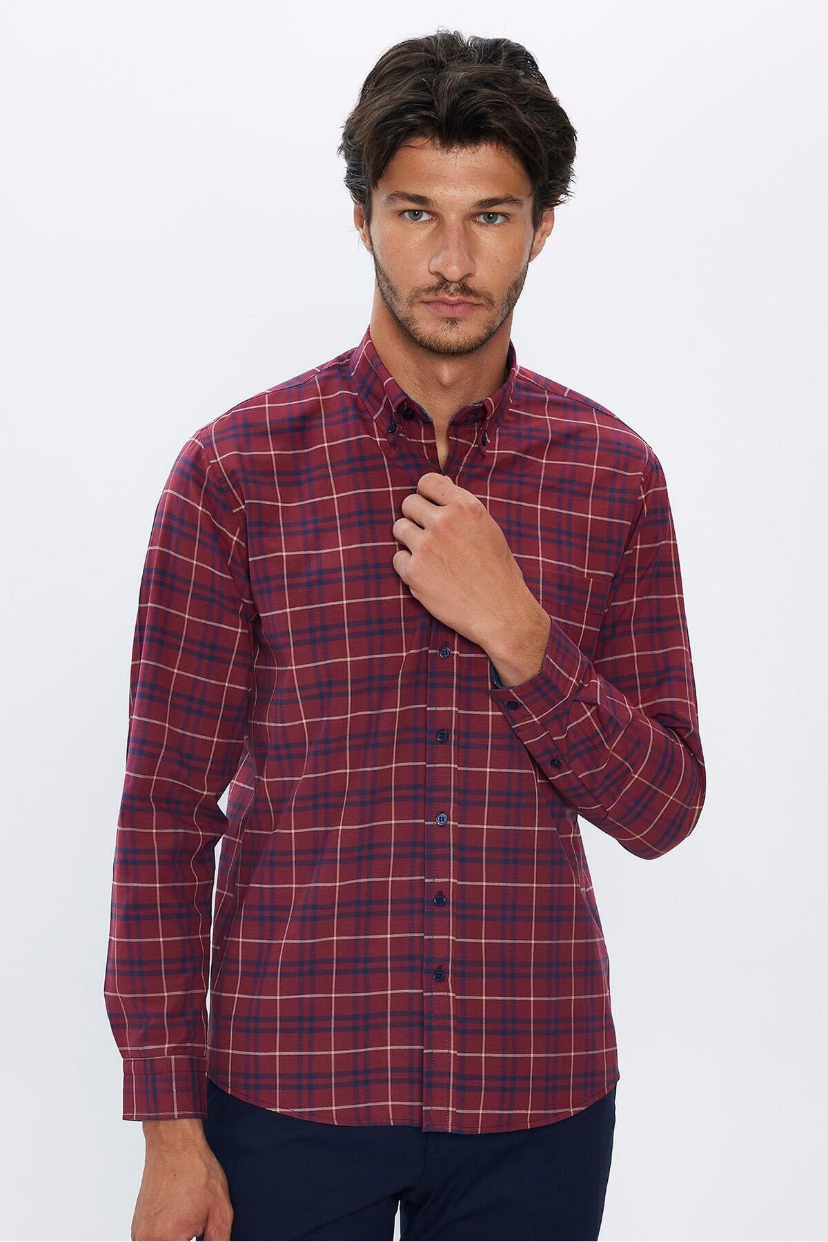 Erkek Regular Fit Klasik Kesim Düğmeli Yaka Küçük Kareli Pamuklu Yeşil-Mavi Gömlek