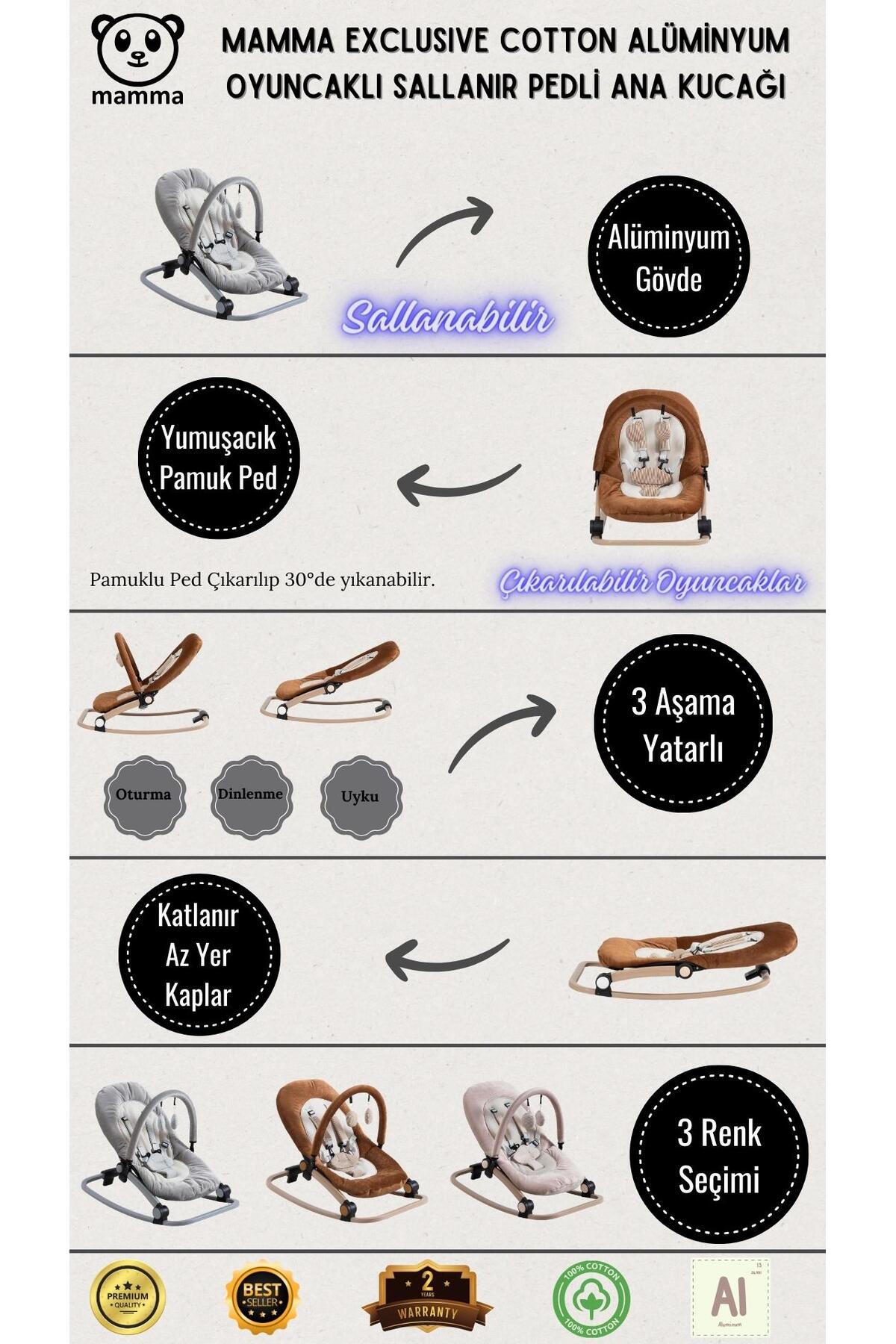 ( Oturma, Dinlenme, Uyku ) • Çıkartılabilir dokunsal ve görsel aktiviteye sahip oyuncaklar • Çıkartılabilen oyuncak barı • Katlanma özelliği.
