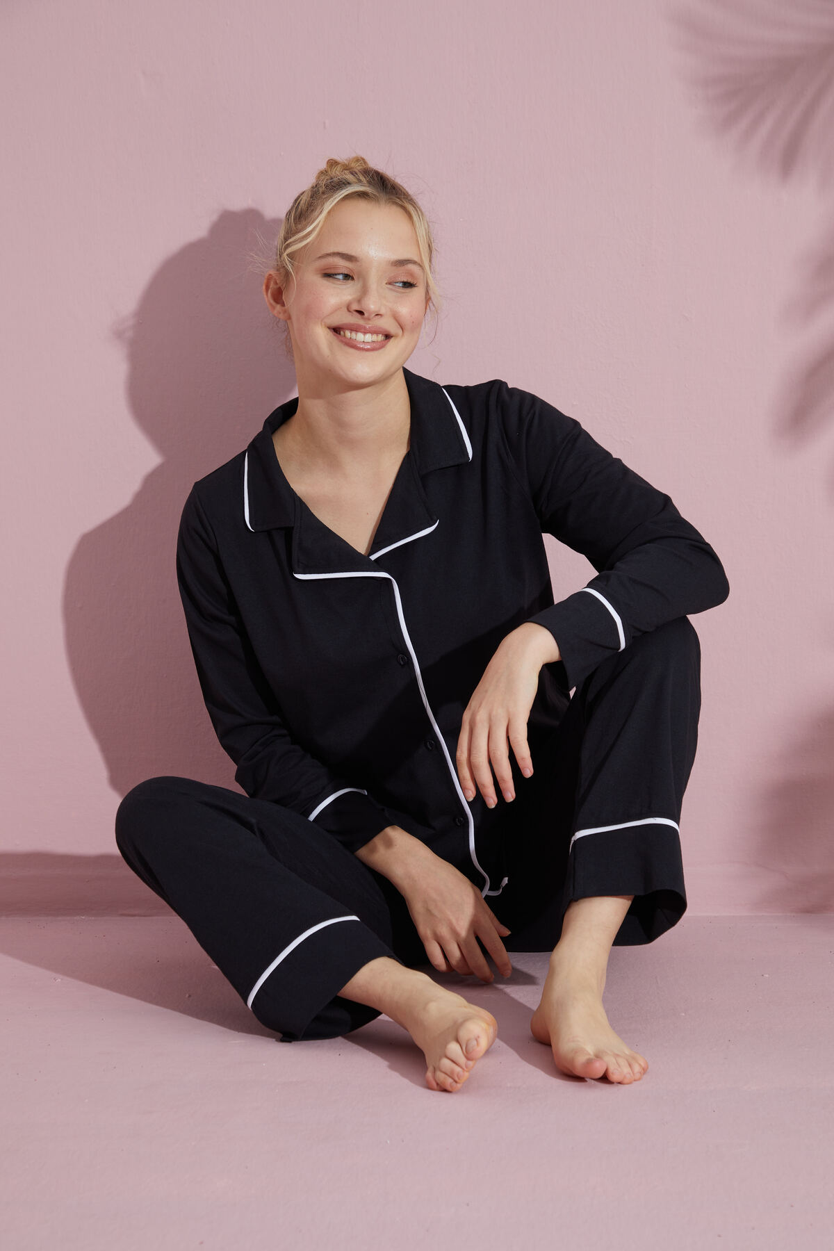 Düğmeli yaka detayı ile şıklığı ve rahatlığı bir arada sunan bu pijama takımı, ev giyiminin vazgeçilmez parçası haline gelir
