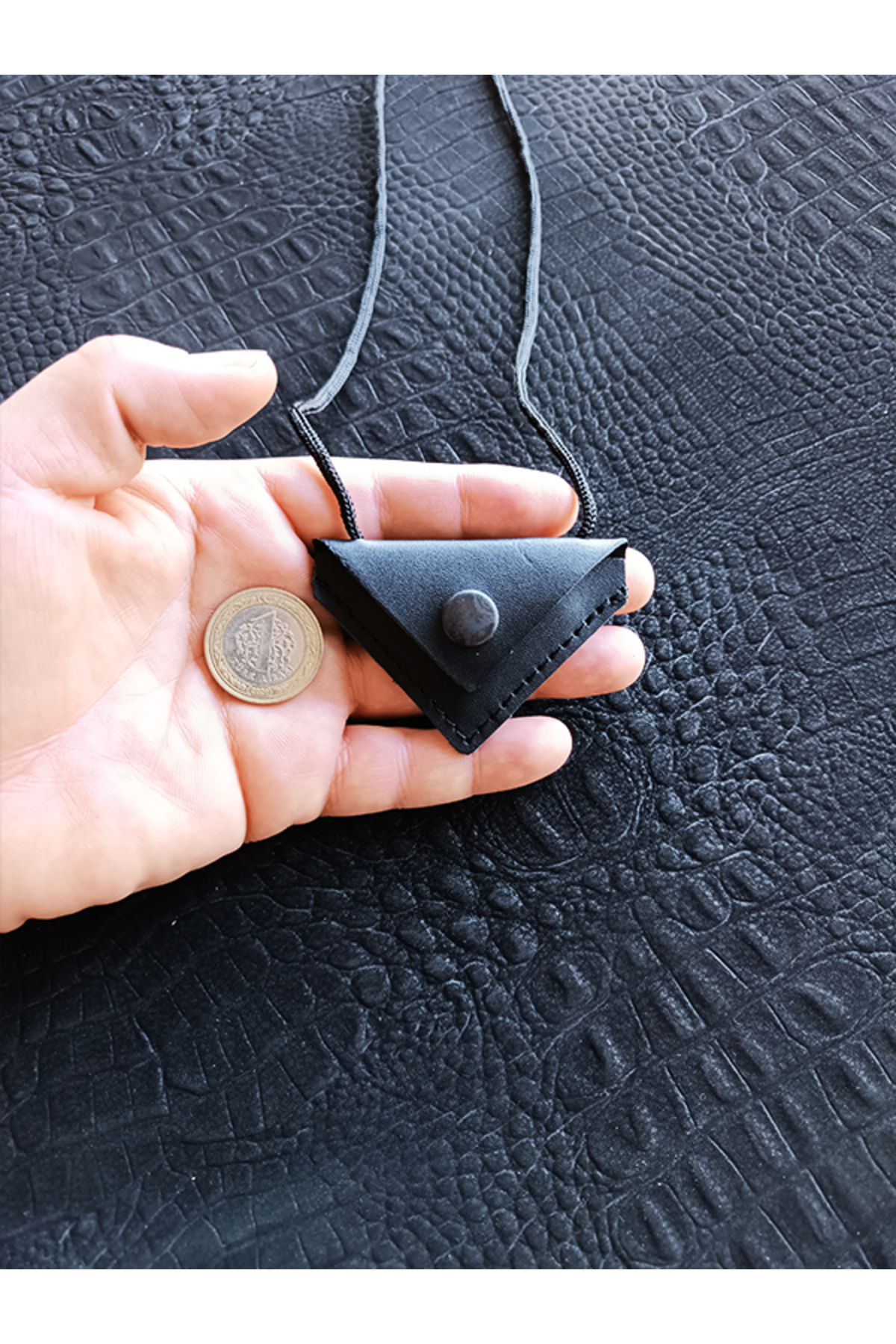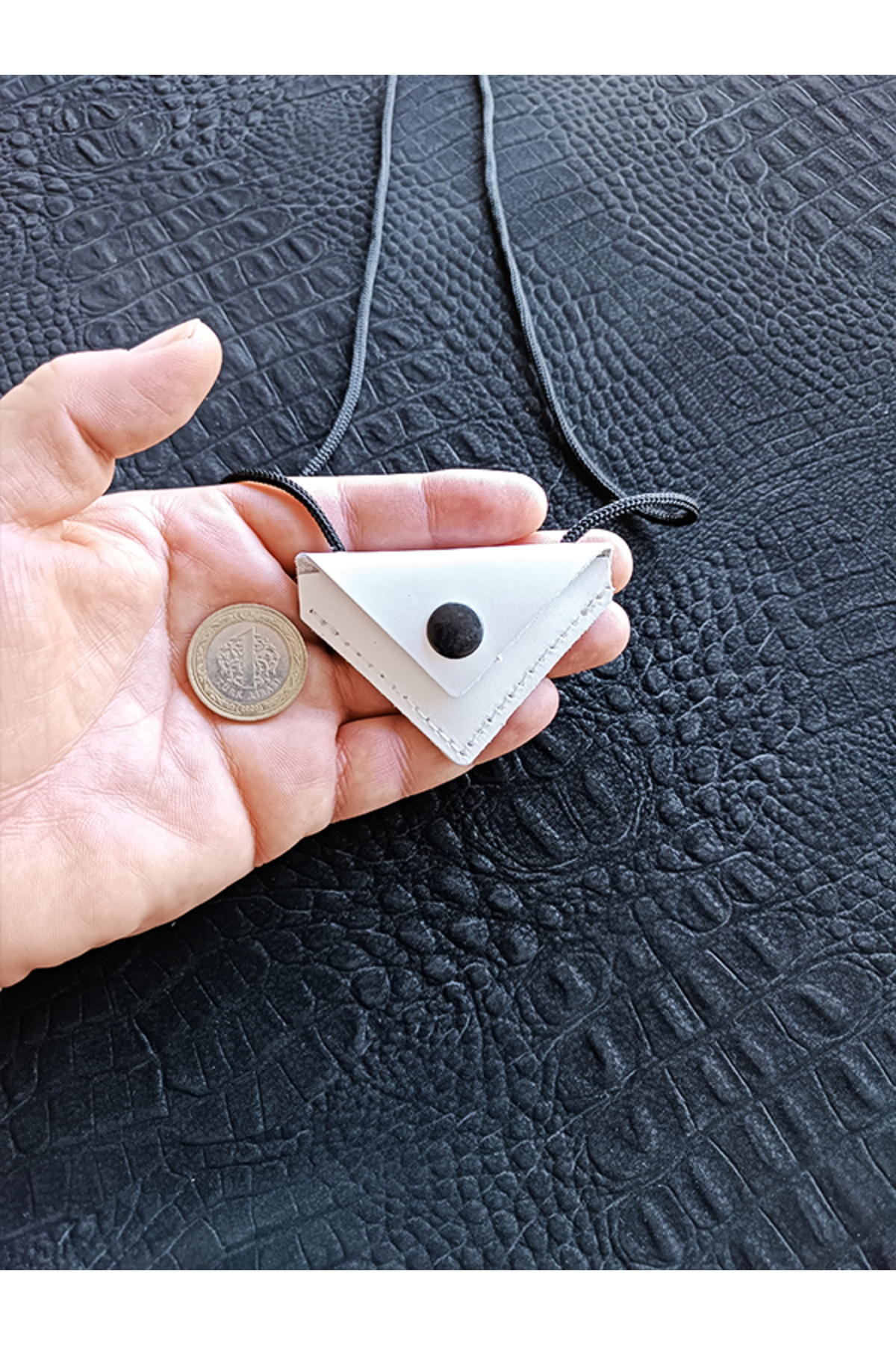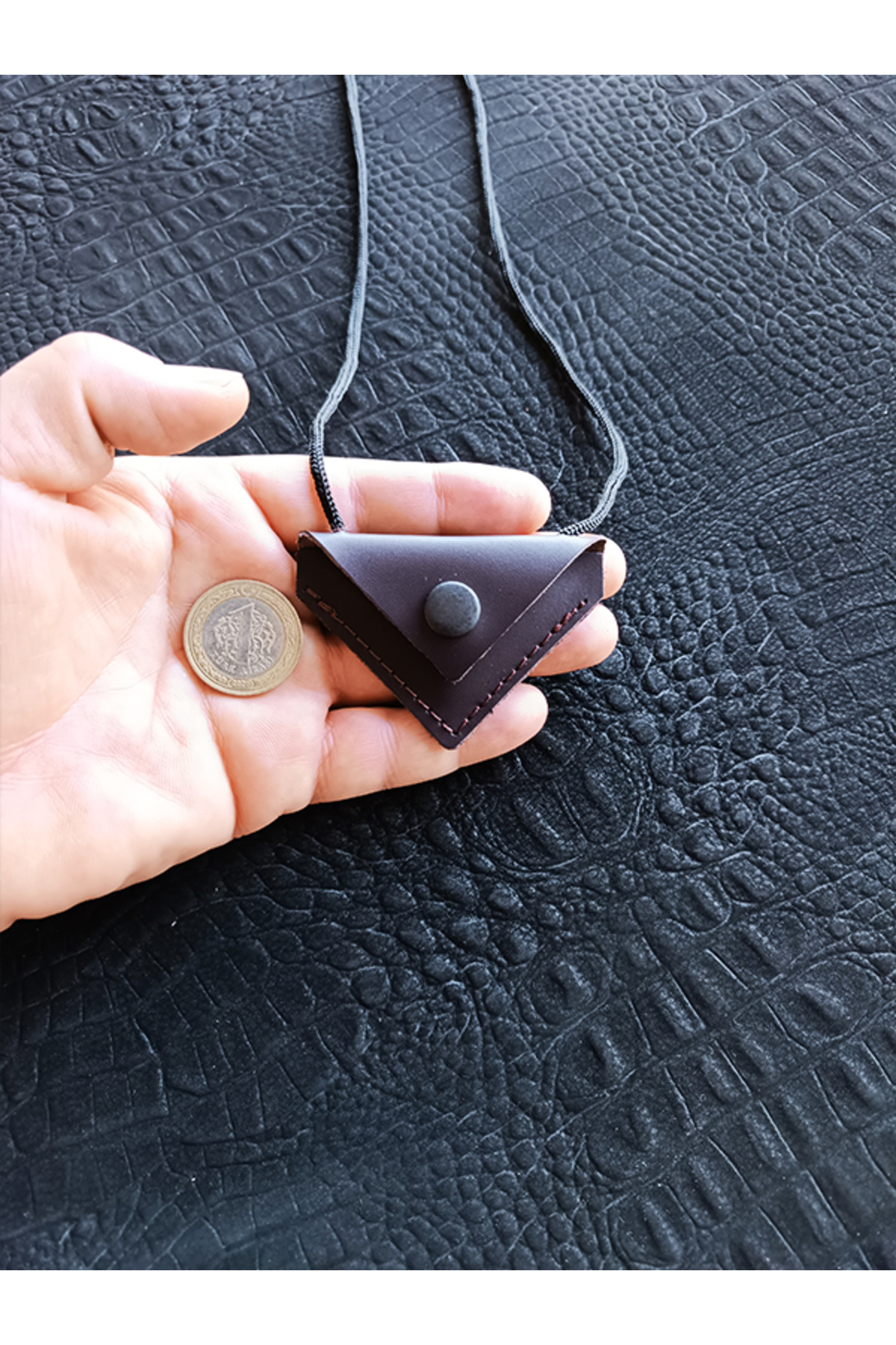 Üçgen şeklindeki ceviz tasarımı, modern ve şık bir görünüm kazandırırken, dualı muska detayıyla da manevi bir anlam taşır