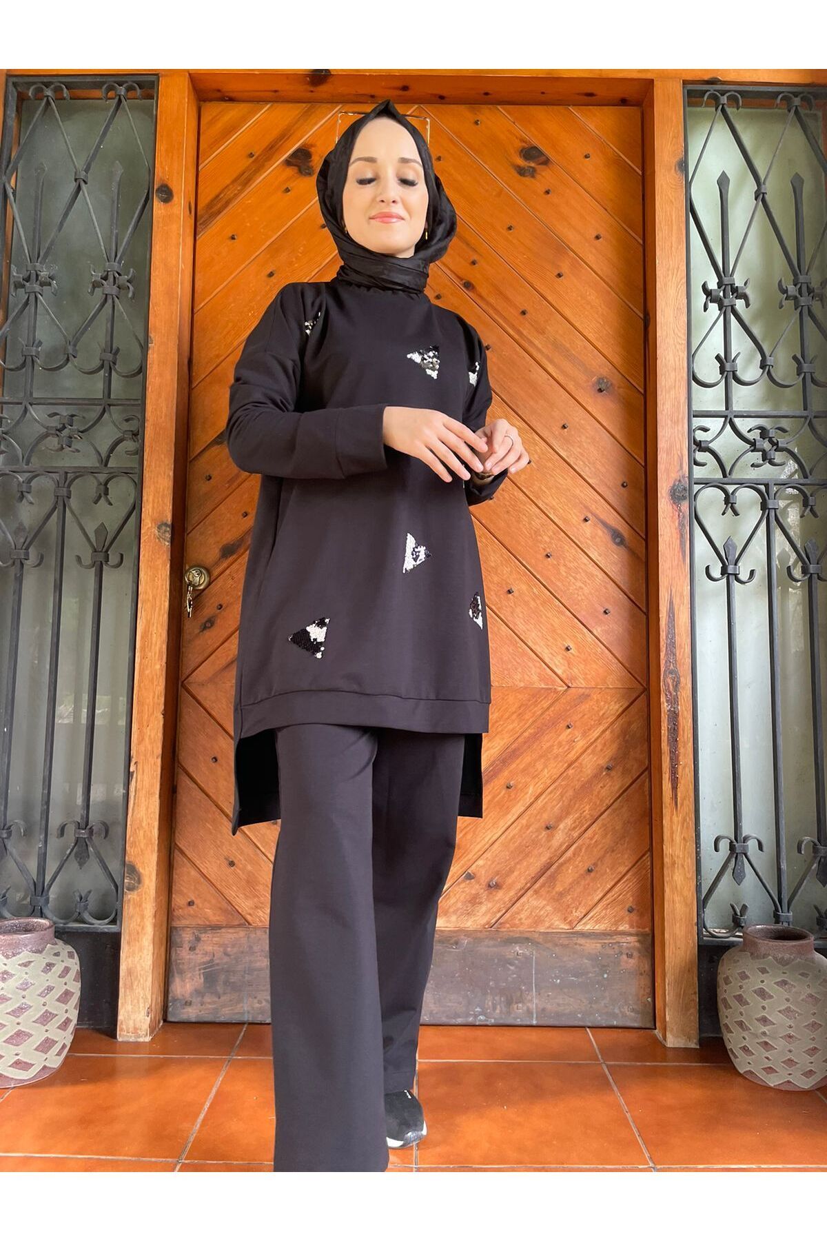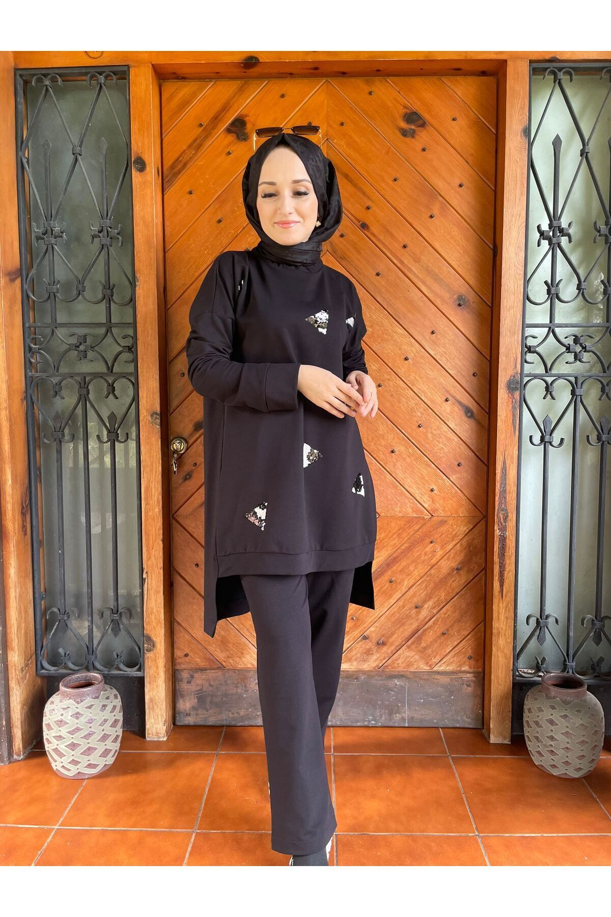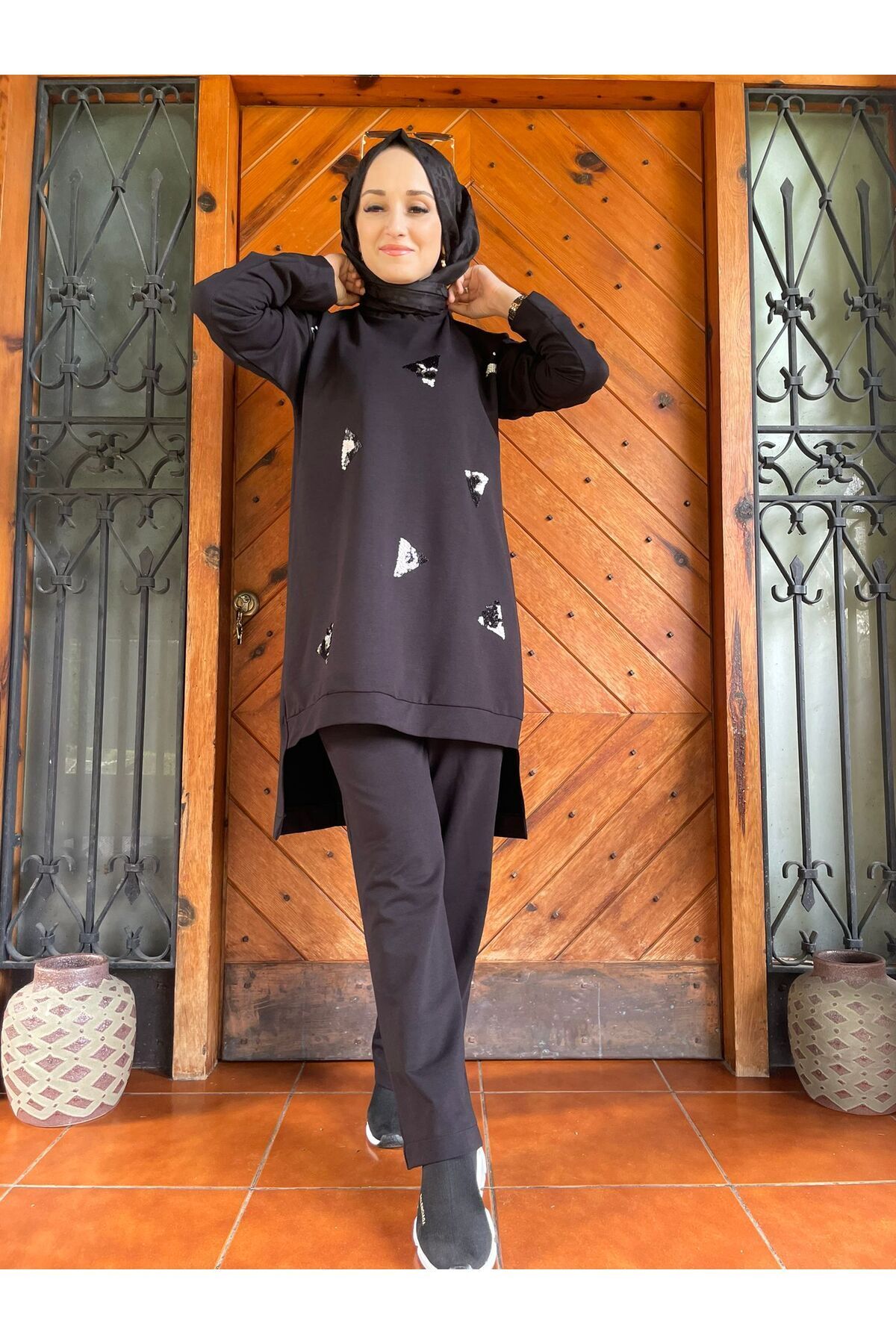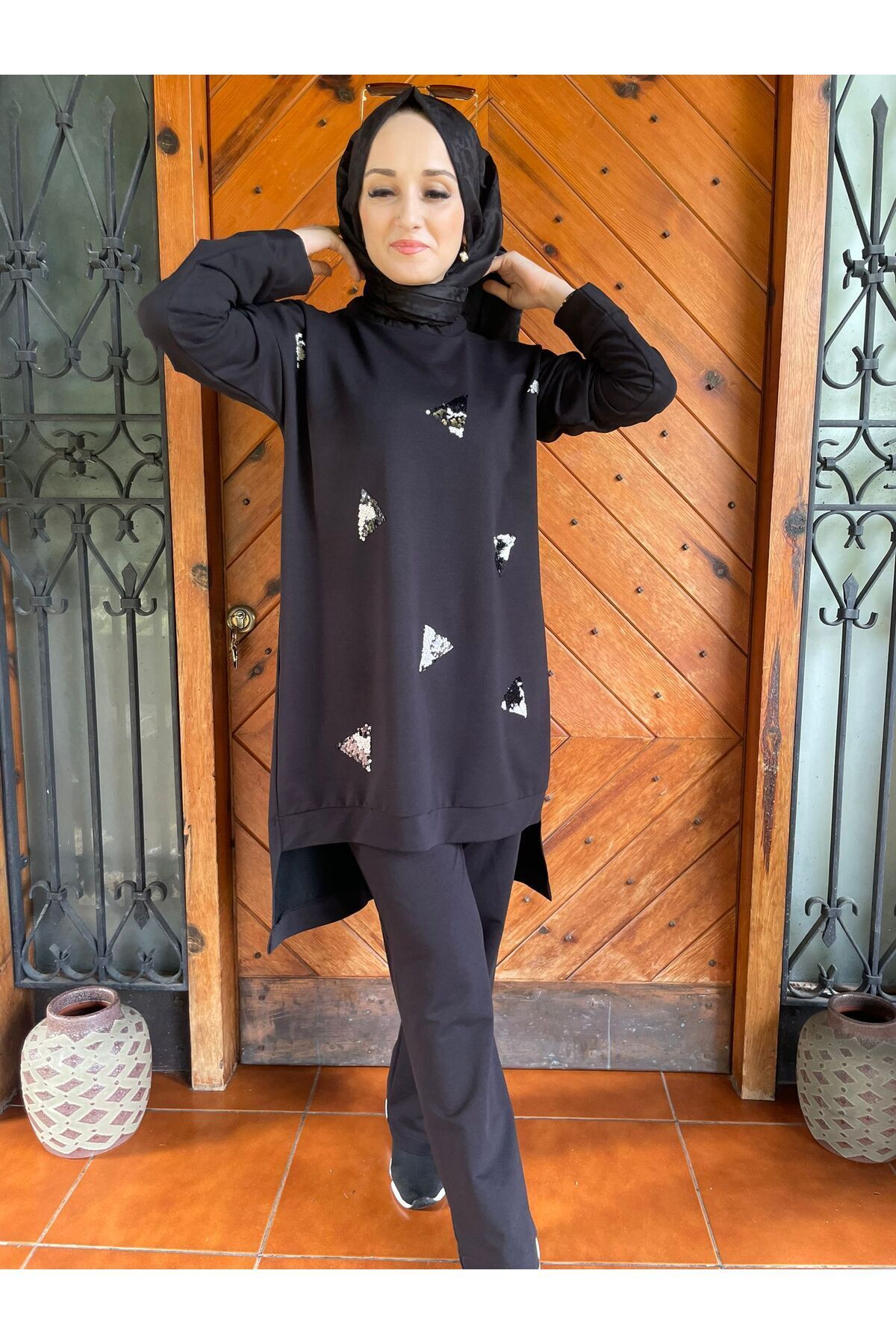Tesettür giyim koleksiyonuna özel tasarlanmış, şık ve modern bir görünüm kazandıran üçgen payet detayları ile dikkat çeker